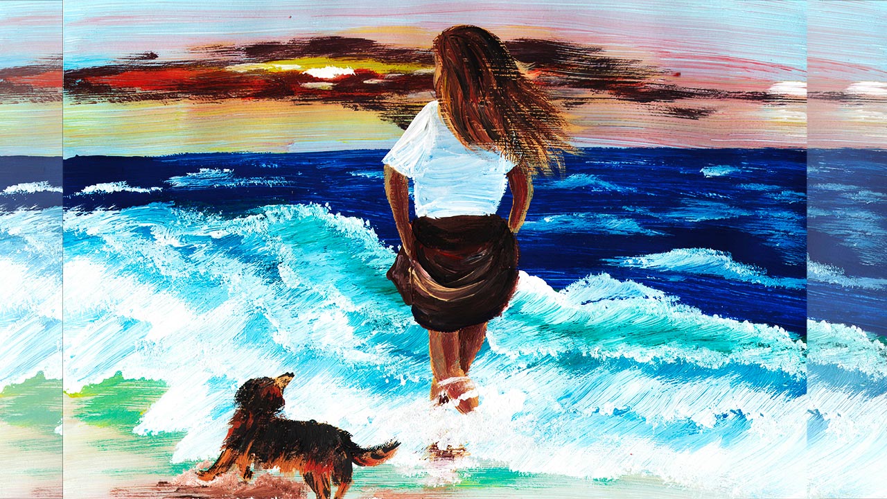 Рисуем девушку на море гуашью. Как нарисовать море гуашью. Морской пейзаж. Девушка с собакой гуашью.