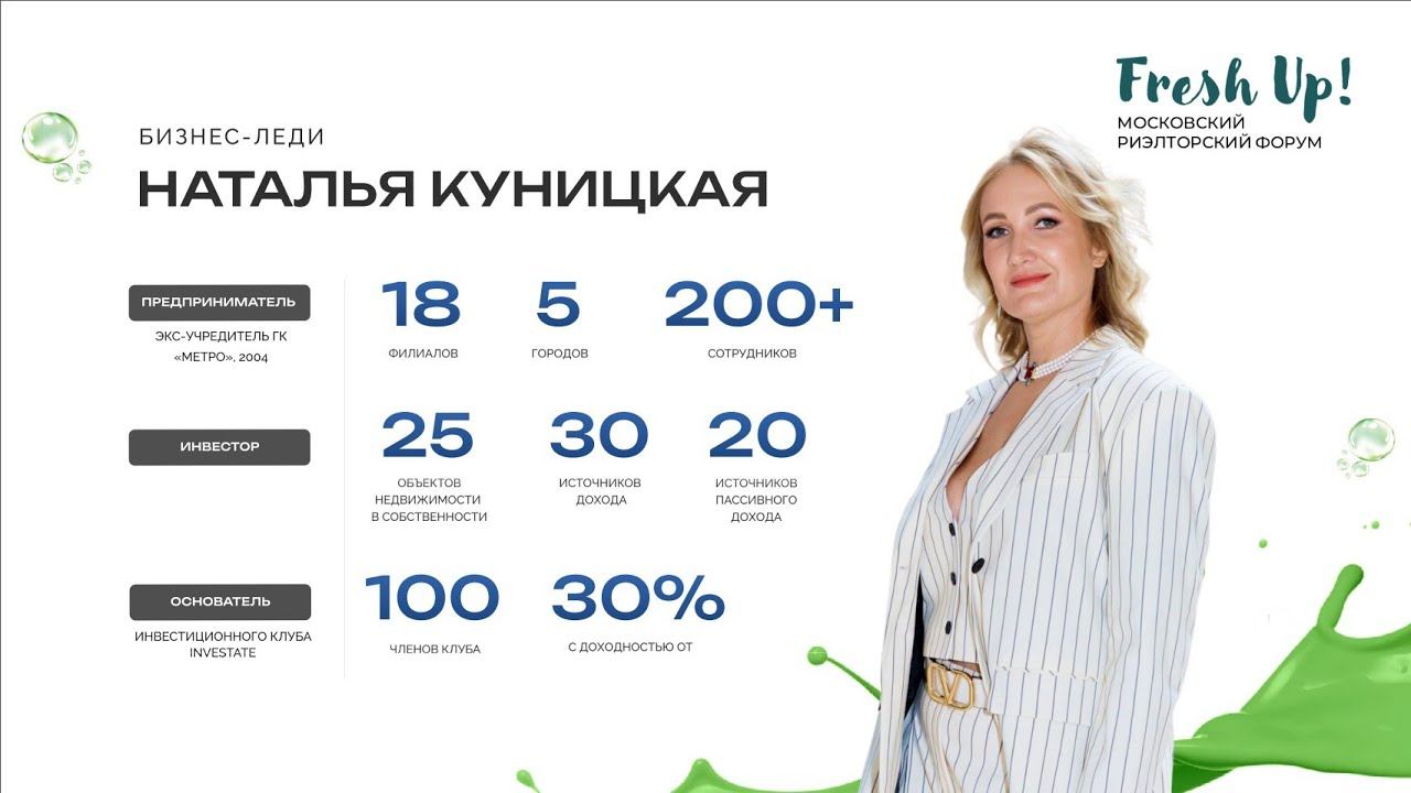 ►Московский риэлторский форум Fresh Up 2024. Секция «Инвестиции» Наталья Куницкая, Предприниматель, инвестор, консультант по формированию пассивного дохода с любой точки финансового уровня клиента. Бизнес-леди. В теме недвижимости более 20 лет. Владеет 25 объектами недвижимости и 27 источниками дохода, 13 из которых – это пассивный доход. Тема: «5 наглых способов инвестиций в недвижимость в нынешних реалиях» – нетривиальные способы инвестирования; – использование кредитного плеча в инвестициях; – как выжать из недвижимости максимум; – ошибки в инвестициях; – как обезопасить себя. #freshup #грм #инвестиции ► Сайт Fresh Up https://event.grmos.ru/ ★ Группа Fresh Up в VK: https://vk.com/freshup_forum ► Сайт ГРМ: https://www.grmos.ru ГРМ в соцсетях: ★ VK: https://vk.com/grmosru ★ Facebook: https://www.facebook.com/grmoscow ★ Instagram: https://www.instagram.com/_grmos_/ ★ Telegram: https://t.me/gildia_grm_bot