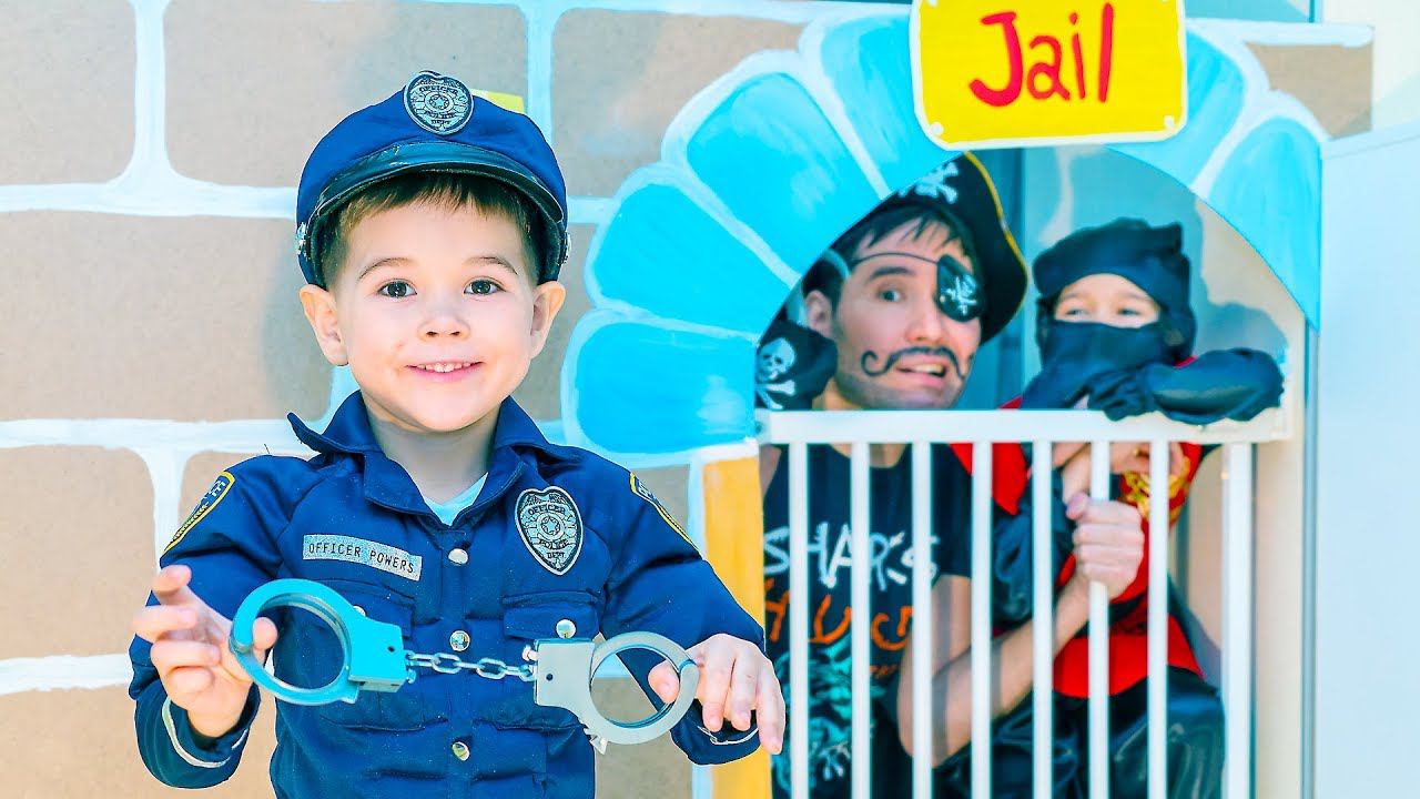 Эрик и Глеб играют с мамой и папой в полицейских. Дама с длинными ресницами попала в беду. Глеб в роли суперполицейского ей поможет. Он закроет всех заключенных в игрушечной тюрьме. Ниндзя и Пират будут удивлены.