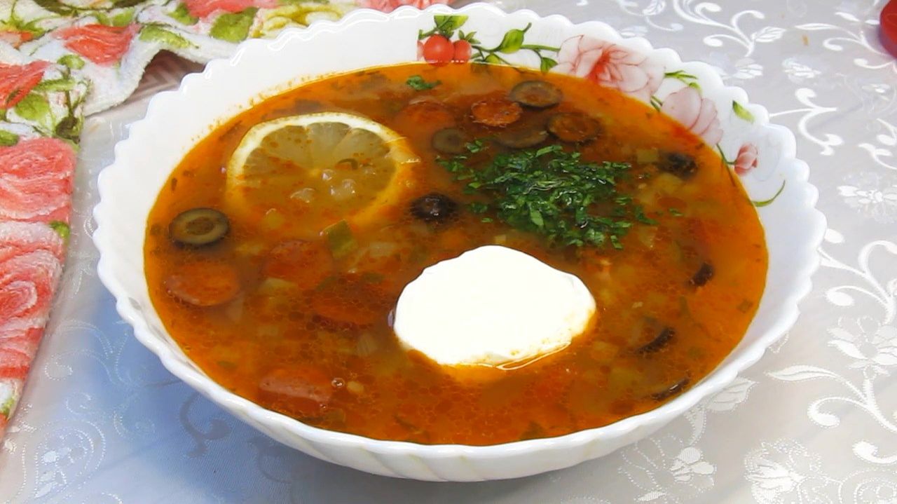 Яркий, пикантный, насыщенный суп не оставит равнодушным никого! Это очень вкусно! Рецепт: Мясной бульон - 2 литра Ассорти мясное - 700 г Лук - 1-2 шт Солёные огурцы - 200 г Маслины, оливки - 50 г Томатная паста- 1 с.л с горкой Соль, перец, сахар по вкусу Лавровый лист Огуречный рассол по желанию Подача с лимоном, сметаной и зеленью