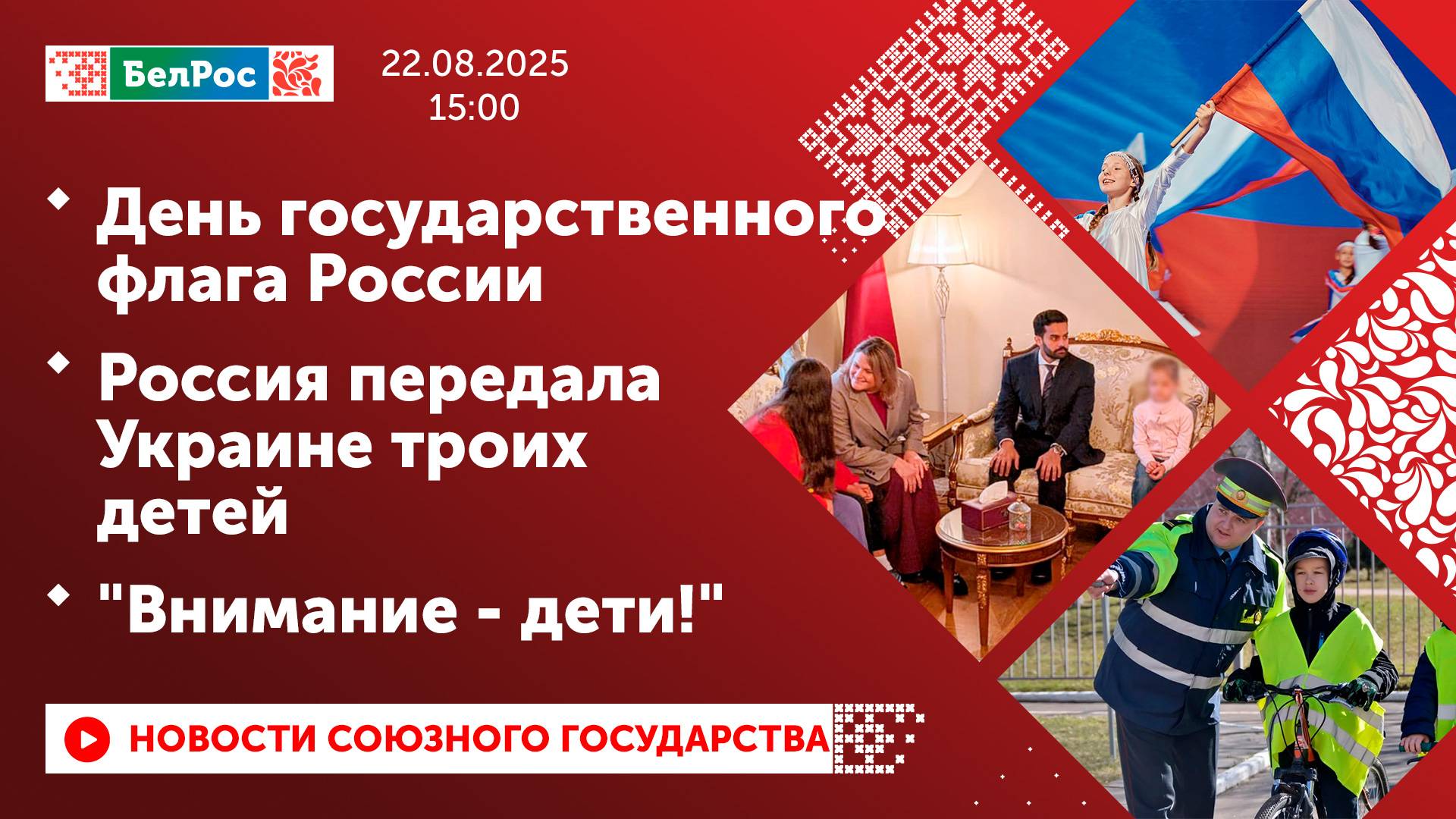 Закадровый текст озвучивает *ИИ Антон* Новости 22.08.2025 на 15:00 - Россия с размахом отмечает День государственного флага. - Андрей Белоусов посетил группировку войск "Север" и наградил отличившихся бойцов. - Россия при посредничестве Катара передала ещё трёх украинских детей в родные семьи. - В Беларуси пройдёт акция по защите самых маленьких участников дорожного движения. Смотрите главные новости Союзного государства на телеканале БелРос. Ссылки на наши соц. сети Сайт: http://belros.tv/ Telegram: https://t.me/belrostv Одноклассники: https://ok.ru/group/55657426976918 ВКонтакте: https://vk.com/belrostv TikTok: https://www.tiktok.com/@belros_tv?_t=... RuTube: https://rutube.ru/channel/23501830/ Яндекс. Дзен: https://zen.yandex.ru/belrostvv Наши подкасты на Яндекс. Музыке: https://music.yandex.ru/album/25615251 #главныеновости #новостисегодня #СоюзноеГосударство