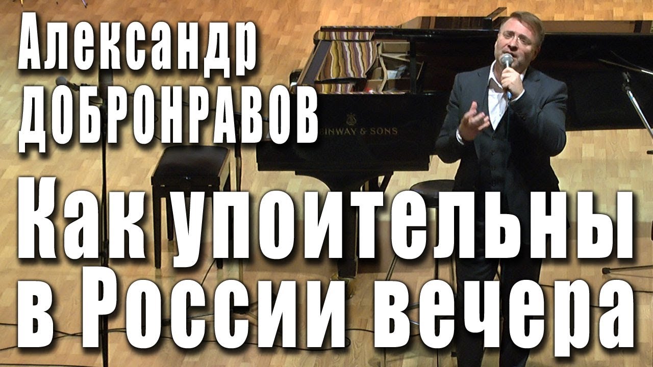 Как упоительны в России вечера. Поёт композитор Александр Добронравов. Стихи Виктора Пеленягрэ. Фрагмент концерта Международного фестиваля «МОСКОВСКАЯ ОСЕНЬ-XXXIX» (Концертный зал «Союза композиторов», 12 ноября 2017 года). Страница сайта «Союза московских композиторов», посвящённая Международному фестивалю «МОСКОВСКАЯ ОСЕНЬ-XXXIX» http://xn--b1aanbebkbbpfqcbebcaoyded7a1etm.xn--p1ai/mo/moxxxix/moxxxix.htm Официальный сайт композитора, певца и продюсера Александра Добронравова: http://dobronravov.ru/ Официальный видеоканал Александра Добронравова на Ютубе: https://www.youtube.com/user/alexandrdobronravov Страница Александра Добронравова в соцсети ВКонтакте: https://vk.com/alexandrdobronravov Страница Александра Добронравова в соцсети Facebook: https://www.facebook.com/profile.php?id=100005744912363 Съёмка концерта Международного фестиваля «МОСКОВСКАЯ ОСЕНЬ-XXXIX» - «Retroportal.ru»: https://www.retroportal.ru/