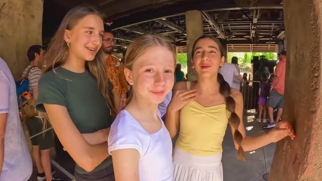 Настя и Эвелин играют в прятки в парке развлечений