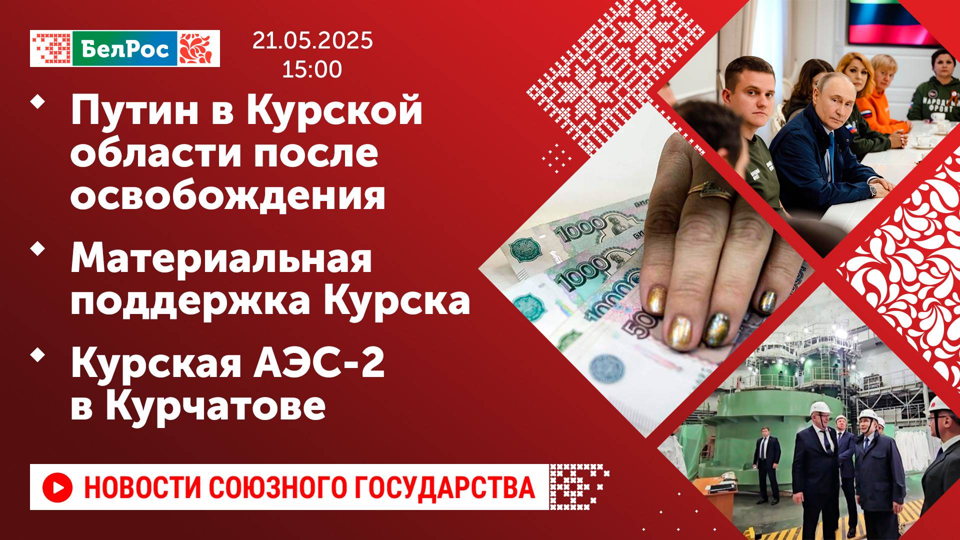 Закадровый текст озвучивает *ИИ Антон* Новости 21.05.2025 на 15:00 - Путин впервые посетил Курскую область после ее освобождения - Жителям Курской области продлят ежемесячную выплату в 65 тыс. российских рублей - Путин: обстановка в отдельных районах Курской области остается сложной - Путин осмотрел строящуюся Курскую АЭС-2 в Курчатове Смотрите главные новости Союзного государства на телеканале БелРос. Ссылки на наши соц. сети Сайт: http://belros.tv/ Telegram: https://t.me/belrostv Одноклассники: https://ok.ru/group/55657426976918 ВКонтакте: https://vk.com/belrostv TikTok: https://www.tiktok.com/@belros_tv?_t=... RuTube: https://rutube.ru/channel/23501830/ Яндекс. Дзен: https://zen.yandex.ru/belrostvv Наши подкасты на Яндекс. Музыке: https://music.yandex.ru/album/25615251 #главныеновости #новостисегодня #СоюзноеГосударство