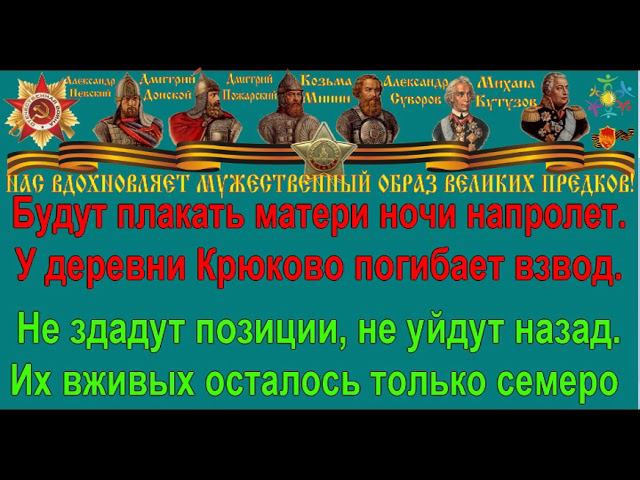 У деревни Крюково Музыка: М.Фрадкин Слова: С.Островой Шёл в атаку яростный 41-й год У деревни Крюково погибает взвод. Все патроны кончились, больше нет гранат, Их в живых осталось только семеро молодых солдат (2 раза). Лейтенант израненный прохрипел: "Вперёд!" У деревни Крюково погибает взвод. Но штыки горячие бьют не наугад. Их в живых осталось только семеро молодых солдат (2 раза). Будут плакать матери ночи напролёт - У деревни Крюково погибает взвод. Не сдадут позиции, не уйдут назад, Их в живых осталось только семеро молодых солдат (2 раза). Отпылал пожарами тот далёкий год, У деревни Крюково шёл стрелковый взвод. Отдавая почести, замерев, стоят В карауле у холма печального семеро солдат (2 раза). Так судьбой назначено, чтобы в эти дни У деревни Крюково встретились они. Где погиб со славою тот бессмертный взвод, Там шумит, шумит сосна высокая, птица гнёзда вьёт! (2 раза). Went to the attack of rage forty-first year. In the village of Kryukovo dies platoon. All ran out of ammo, there is no more grenades. They survived only seven of the young soldiers. They survived only seven of the young soldiers. Lieutenant wounded croaked: "go Ahead!" In the village of Kryukovo dies platoon. But bayonets hot beat not random. They survived only seven of the young soldiers. СПОРТИВНО-ПАТРИОТИЧЕСКОЕ ДВИЖЕНИЕ "ДРУЖБА" https://vk.com/sport.patriot.drujba Созданию фильма оказывали содействие: Общероссийская общественная организация «Офицеры России» (ООО "ОФИЦЕРЫ РОССИИ"); Военный университет Министерства обороны Российской Федерации (ВУ МО РФ); Региональная общественная организация ветеранов Центрального аппарата органов внутренних дел (РООВ ЦА ОВД); Федеральная служба по контролю за оборотом наркотиков (ФСКН); Международный фонд славянской письменности и культуры; Парламентский центр «Комплексная безопасность Отечества» (ПЦ "КБО"); Совет ветеранов "ШАБОЛОВКА 6"; Межрегиональная общественная организация «Легендарный подвиг»; Межрегиональная общественная организация «Кремль» (МРОО "КРЕМЛЬ"); Академия национальной безопасности, обороны и правопорядка; Фонд ветеранов защитников Отечества "МЕЧ" (Фонд ВЗО "МЕЧ"); Межрегиональная общественная организация содействия развитию страйкбола "Федерация Страйкбола"; Агентство конкурентной разведки и экономической безопасности "Паутина"; Федерация Русского Боевого Искусства - Российская Отечественная Система Самозащиты (ФРБИ РОСС); Военно-спортивный клуб имени Александра Невского; Бюджетное учреждение Молодёжный центр "Маяк" (БУ МЦ "МАЯК"); Детско-юношеский клуб "Энергия" (ДЮК "ЭНЕРГИЯ"); Дайвинг центр АКВА-ГЛОБУС. #ПАТРИОТИЗМ #НашПатриотизм #РоссияВперёд #БессмертныйПолк #ЗОЖ #СПОРТ #МойВетеран #ВотМойГерой #РоднойГерой #МыПомним #Россия #ПАТРИОТ #Победа #9МАЯ #СПАСИБОДЕДУЗАПОБЕДУ #70летПобеды #ДеньПобеды #Ура #НизкийПоклонВетеранам #МОЛОДЁЖНЫЙПАТРИОТИЗМ #ПАТРИОТИЗМВШКОЛЕ #ПАТРИОТИЗМВДЕТСАДУ СПОРТИВНО-ПАТРИОТИЧЕСКОЕ ДВИЖЕНИЕ "ДРУЖБА"