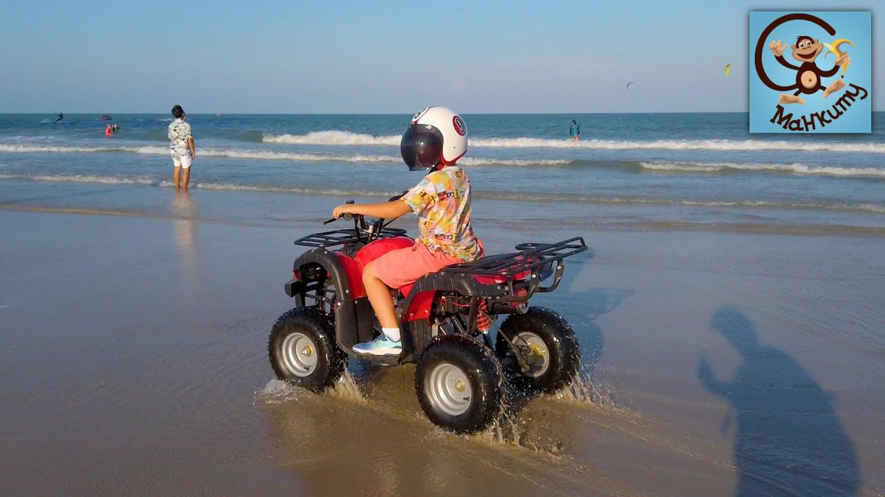 Дети и Машина. Дети за рулём, Детский квадроцикл ездит по песку. Манкиту