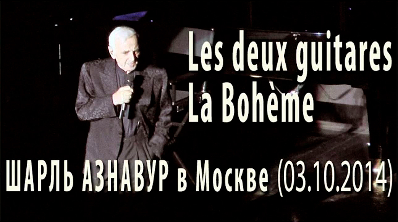 Шарль Азнавур. Фрагмент «Прощального концерта» в Москве 3 октября 2014 года. Песни «Две гитары» и «Богема». Charles Aznavour à Moscou. Les deux guitares / La Bohème Крокус Сити Холл (Crocus City Hall) http://www.crocus-hall.ru/ Видеосъёмка концерта «РЕТРОпортал.ру» https://www.retroportal.ru/