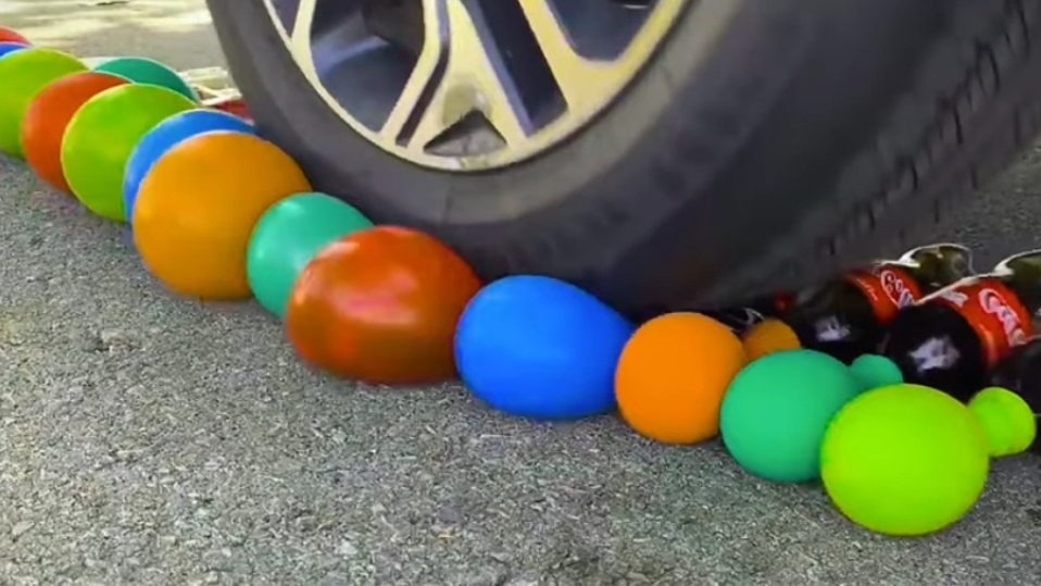 Машина переезжает разные цветные предметы.