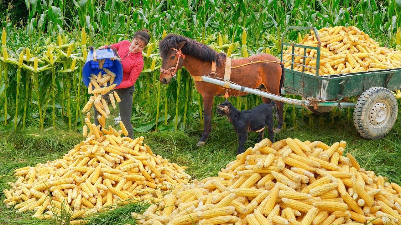 Use Horse Carts to Harvest Large Amounts of Crushed Corn for Livestock Feed. Ly Tieu Toan