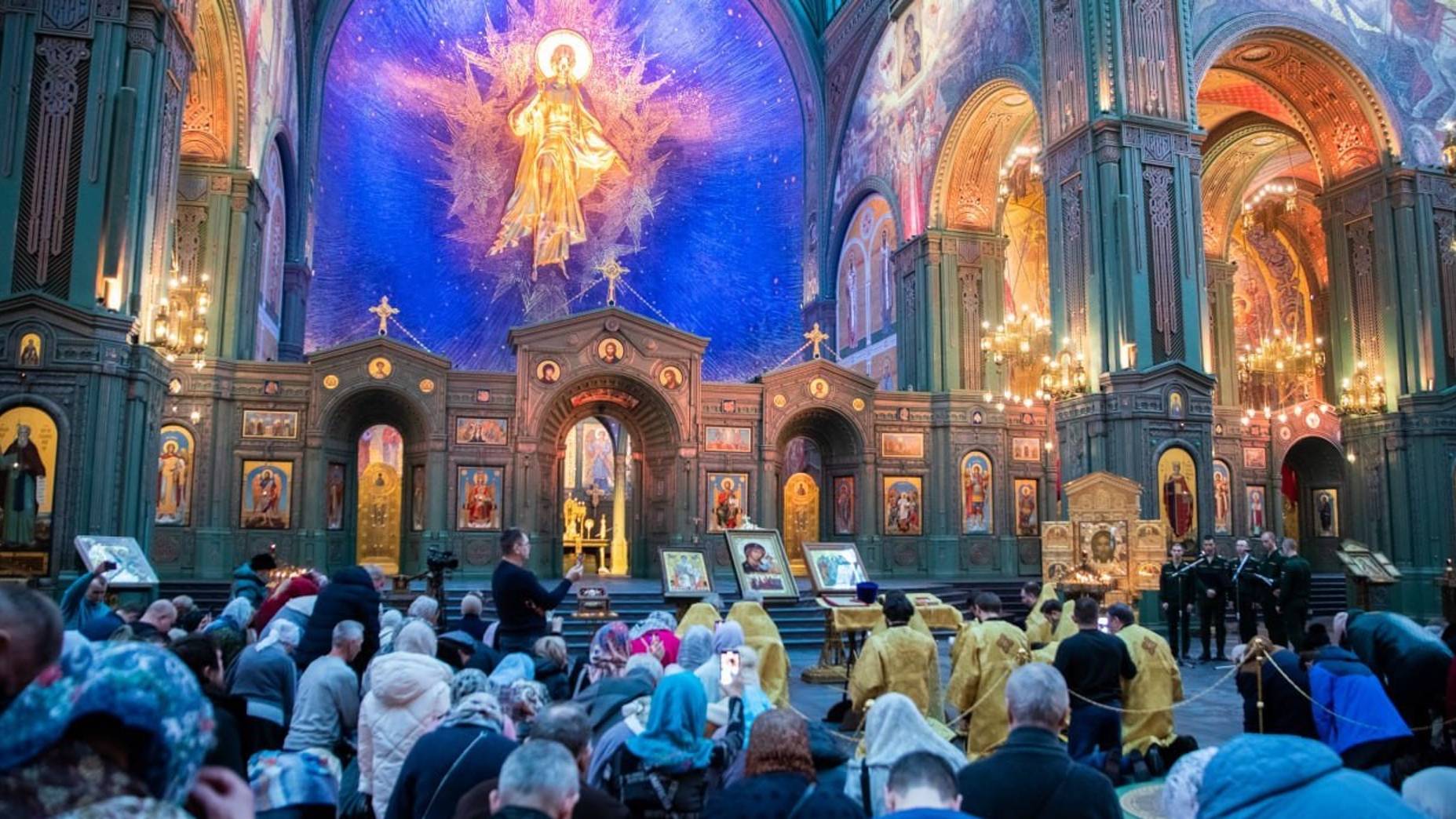 Коленопреклонение на Молебне за Победу перед иконой Казанской Божией Матери"Державный Покров" в ГХВС