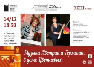 НГОНБ 2016-12-14 14 декабря 2016 года в культурном центре Дом Цветаевой НГОНБ состоялся литературно-музыкальный вечер «Музыка Австрии и Германии в доме Цветаевых». Ведущий: В. Кузин. Исполнители: М. Кузина-Койфман (скрипка), Н. Щербина (фортепиано).