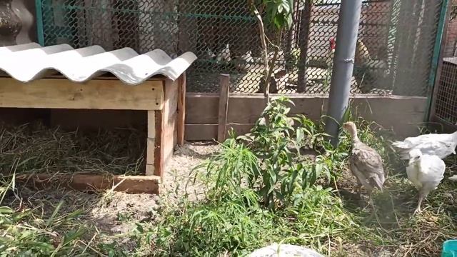Соорудили укрытие от дождя для маленьких индюшат.Живность на участке.