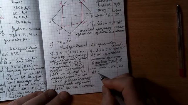 Построение сечений с помощью утверждения 1 из признака параллельности прямой и плоскости, либо используя альтернативные рассуждения