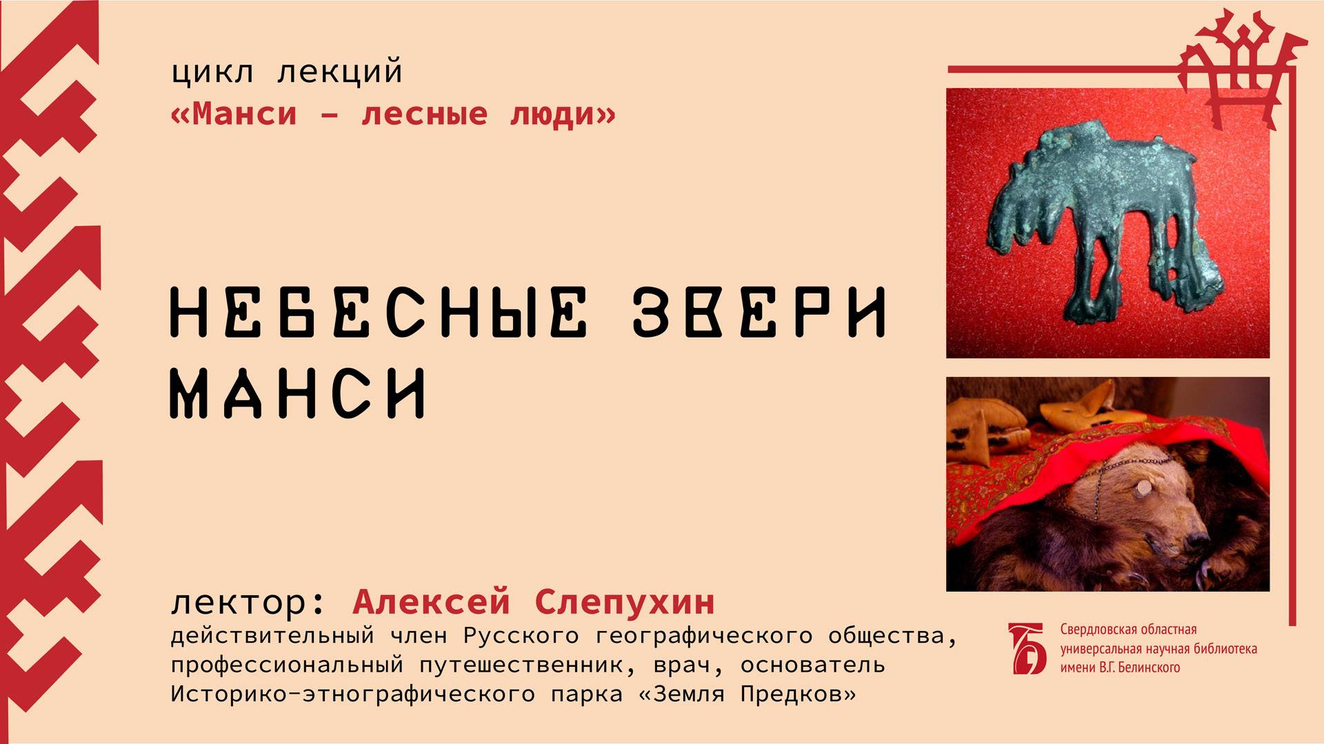 Лекция Алексея Слепухина из цикла «Манси – лесные люди». Небесные звери и птицы играли во все времена в жизни таежных охотников важную роль. Об этом люди старались никогда не забывать. Но времена меняются – в тайге все меньше остается коренного населения. Охотники понемногу покидают эти места. Потому и память о том, кто жил среди богов, периодически спускаясь в мир людей, стирается – некому верить и соблюдать законы предков, да и рассказывать теперь особо некому. Мир таежных охотников меняется… Лектор – Алексей Слепухин, профессиональный путешественник, руководитель Комиссии по этнографии и исторической географии Свердловского отделения Русского географического общества. Свердловская областная универсальная научная библиотека им. Белинского http://book.uraic.ru/ сайт https://vk.com/club6745014 VK