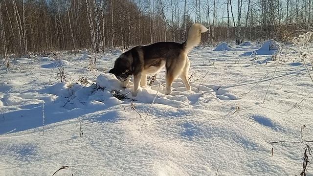 Животные. Сибирская Хаски обожает зиму и снег. А еще она любит подснежную охоту. И очень забавно охотится на мышей под снегом.