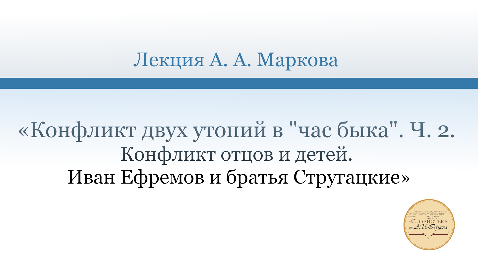 5 апреля на заседании клуба «Знание» состоялась лекция главного библиографа отдела краеведческой литературы Андрея Маркова, посвящённая советским утопическим романам и различным идеологическим установкам их авторов. Андрей Алексеевич дал сравнительный анализ романа И. Ефремова «Час быка» и повести братьев А. и Б. Стругацких «Трудно быть богом». Были рассмотрены вопросы истории создания повести Стругацких, показаны пересечения сюжетных линий двух произведений и различия в толковании образов землян и инопланетян авторами. Завершая встречу, Андрей Алексеевич сделал вывод: «Ефремов – это возвращение к философии Сен-Симона и эпохе Просвещения, эстетике Античности и Возрождения, идеологии революционных демократов и народничества. Стругацкие – это новая «западная» культура. Новая идеология – идеология неолиберализма. Увлечение молодых фантастов конца 50-х – 60-х годов ХХ века англо-саксонской фантастикой было не случайно. Они находили в ней отражение своего мировоззрения». «Старая, дореволюционная интеллигенция, как и советская интеллигенция первой половины ХХ века, видела свою цель в служении Отечеству, государству, народу, идее, искусству, литературе. Новое поколение шестидесятников ощущало себя хозяевами жизни и никому служить не хотело. А некоторые интеллигенты мнили себя богами в стране Еху (Свифт "Четвёртое путешествие Гулливера"). И страдали под их властью. Роман "Трудно быть Богом" об этом: о Гулливере, которого заставляли полюбить Еху», – отметил А. Марков. После доклада участники заседания задали вопросы Андрею Алексеевичу, поделились своими мнениями о творчестве братьев Стругацких и познакомились с материалами книжно-журнальной выставки, подготовленной к встрече сотрудниками отдела обслуживания.
