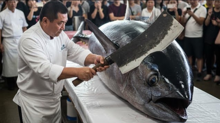 Посмотрите как быстро мастер разделывает гигантского тунца 500кг.