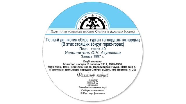 По ла-й да пистиң эбире турған тағлардың-тағлардың (В этих стоящих вокруг горах-горах). Плач, текст 40. Исполнитель О.Н. Акулякова. Запись 1997 г. Опубликовано: Фольклор шорцев: В записях 1911, 1925-1930, 1959-1960, 1974, 1990-2007 годов. Новосибирск: Наука, 2010. 608 с. (Памятники фольклора народов Сибири и Дальнего Востока; т. 29).