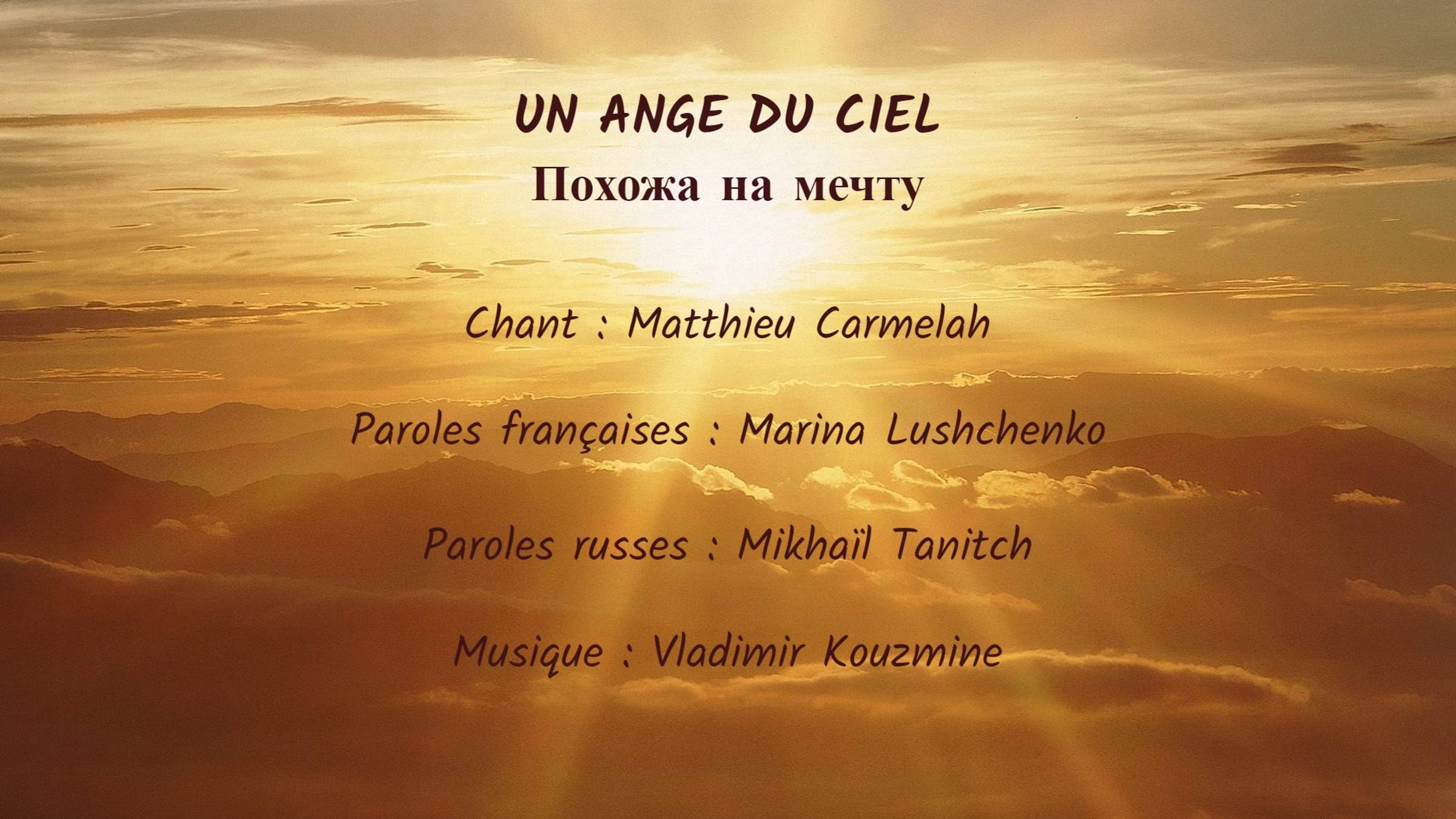 « Un ange du ciel », adaptation française d’une chanson rock russe. «Похожа на мечту», французская версия песни из репертуара Владимира Кузьмина. Paroles françaises : ©Marina Lushchenko Перевод на французский язык: ©Марина Лущенко Mon site Web / Мой сайт: www.chansonrusse.fr UN ANGE DU CIEL Le jour J viendra, et l’heure H aussi Dans les bras l’un de l’autre nous jettera la vie Et cette rencontre, au fond d’nos cœurs, Fera naître l’amour et le bonheur Refrain Tu seras comme dans mes rêves : Inconnue et familière D’une beauté magique mais réelle Tu seras comme dans mes rêves : Ruissellante de lumière Venue de loin à mon appel Venue à mon appel Comme un ange du ciel On se croisera, on se reconnaîtra Tôt ou tard, crois-moi, cet instant viendra Il faut que j’te trouve et, pour ta part, Ne passe pas devant moi sans me voir Refrain ПОХОЖА НА МЕЧТУ Настанет мой день, наступит твой час И сама судьба познакомит нас И радуга вспыхнет на встрече той Своею любовью и мечтой... Припев Я тебя себе придумал Осветил волшебным светом И поверил в эту красоту Я тебя такой придумал Чтобы ты по всем приметам Была похожа на мечту Похожа на мечту... На мою мечту... Я встречу тебя, ты встретишь меня Доживём с тобой до такого дня Ищу тебя всюду, и ты, гляди, Нечаянно мимо не пройди! Припев