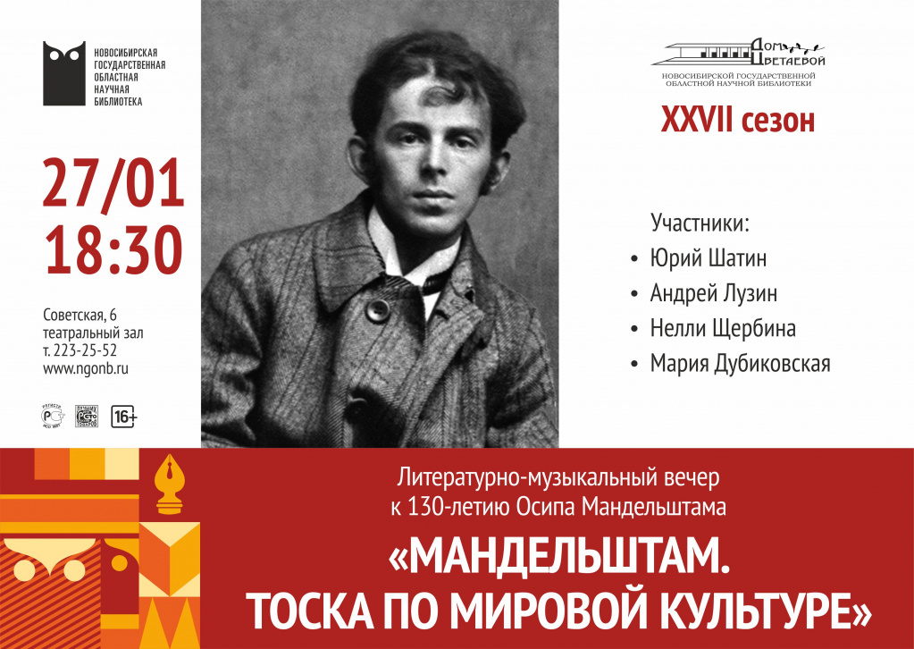 НГОНБ 2021-01-27 27 января в театральном зале НГОНБ состоялся литературно-музыкальный вечер «Мандельштам. Тоска по мировой культуре», организованный Культурным центром Дом Цветаевой. Вечер приурочен к 130-летию со дня рождения Осипа Эмильевича Мандельштама — прекрасного и бесконечно талантливого русского поэта, прозаика и переводчика, эссеиста, критика, литературоведа, чьё творчество стало одной из вершин Серебряного века русской литературы, а трагическая судьба — символом целого поколения. В вечере приняли участие: Юрий Шатин, доктор филологических наук, профессор поэты Андрей Лузин и Мария Дубиковская Нелли Щербина (фортепиано).