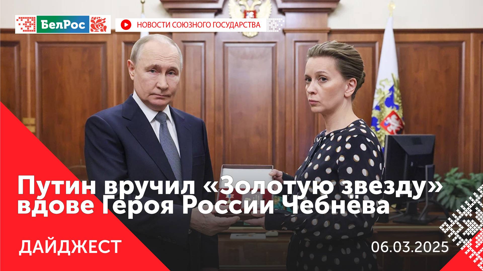 *Главное на 6 марта 21:00* Закадровый текст озвучивает *ИИ Антон* - Владимир Путин вручил "Золотую Звезду" Героя России вдове Сергея Чебнева. - Развитие беспилотников в центре внимания Александра Лукашенко. - Российским регионам спишут более триллиона рублей долгов. - Гунба: Россия всегда была последовательна в своей поддержки. - Госдума планирует ввод наказания за несообщение о подготовке диверсий. - На вокзалах Беларуси начинают собирать монеты для памятника героям ВОВ. - С 1 марта мобильная связь в Союзном государстве доступна по домашним тарифам. - В Национальном центре "Россия" открылась новая выставка. - Михаил Мишустин осмотрел теплицы, где круглый год выращивают розы. - Участник СВО организовал ремонт старых мотоциклов для нужд передовой. - Житель Кузбасса вырастил больше 100 тысяч тюльпанов к 8 марта. - Четыре боевика нейтрализованы в результате контртеррористической операции в Дагестане. - В ДНР пресечён канал незаконной миграции. - Расчёты беспилотников поразили вражеский пункт управления БПЛА в Херсонской области. Смотрите главные новости Союзного государства на телеканале БелРос. Ссылки на наши соц. сети Сайт: http://belros.tv/ Telegram: https://t.me/belrostv Одноклассники: https://ok.ru/group/55657426976918 ВКонтакте: https://vk.com/belrostv TikTok: https://www.tiktok.com/@belros_tv?_t=... RuTube: https://rutube.ru/channel/23501830/ Яндекс. Дзен: https://zen.yandex.ru/belrostvv Наши подкасты на Яндекс. Музыке: https://music.yandex.ru/album/25615251 #СоюзноеГосударство #главныеновости #новостисегодня