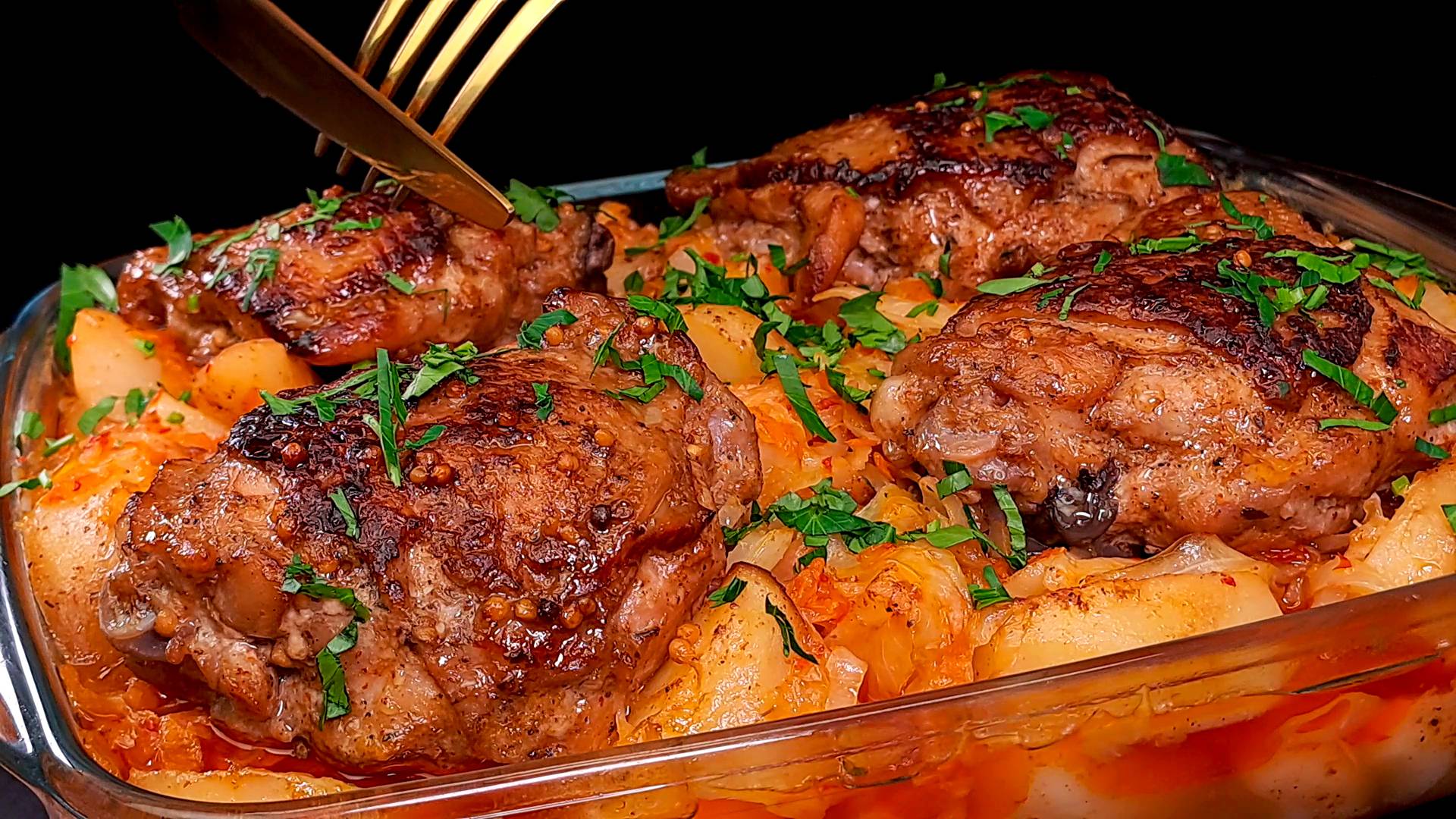 Ингредиенты для рецепта: куриные бедра 4 штуки. соль, паприка, черный перец. 3 зубчика чеснока. 2 ложки майонеза. 1 ч.л. французской горчицы. 1 ч.л. мёда. перец чили по вкусу. 20 миллилитров соевого соуса. картофель 500 грамм. 1 белая луковица. 1 морковь. 1 столовая ложка жареной паприка. капуста 500 грамм. свежая зелень петрушки. Подписывайся на канал и делись видео с друзьями. Также у меня на канале еще очень много вкусных рецептов, и еще больше рецептов ждет вас впереди. Вконтакте - https://vk.com/vkusnierecipe Одноклассники - https://ok.ru/group/70000000861442 Дзен - https://dzen.ru/vkusnierecipes https://dzen.ru/isrecipe Весь музыкальный контент, использующийся в видео на данном канале размещён на основании лицензии Creative Commons 4.0 вариант лицензии CC0 (https://creativecommons.org/licenses/by/4.0/) с медиатеки, где не требуется указания авторства.