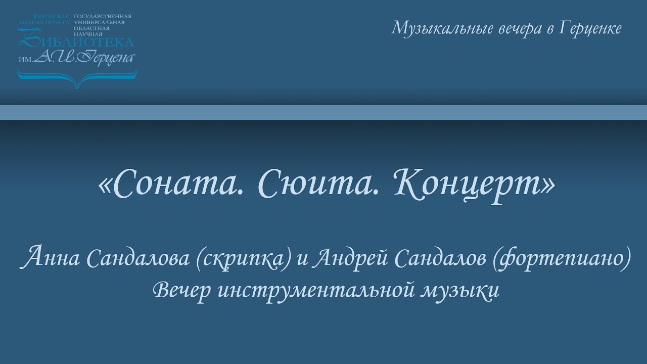 «Соната. Сюита. Концерт» - так назвали свой концерт из цикла «Музыкальные вечера в Герценке», состоявшийся в Герценовском (большом) зале 28 августа, Анна и Андрей Сандаловы. Для многочисленных почитателей классической музыки и великолепного дуэта мы представляем видеозапись этого замечательного Вечера инструментальной музыки. ПРОГРАММА 1. Альфред Шнитке. Сюита в старинном стиле. В пяти частях. 2. Иоганн Себастьян Бах. Итальянский концерт. Ч. 1. 3. Сезар Франк. Соната для скрипки и фортепиано ля мажор. В четырёх частях. Сайт библиотеки им. А. И. Герцена – http://herzenlib.ru/ (материал от 28 авг. 2020 г.)