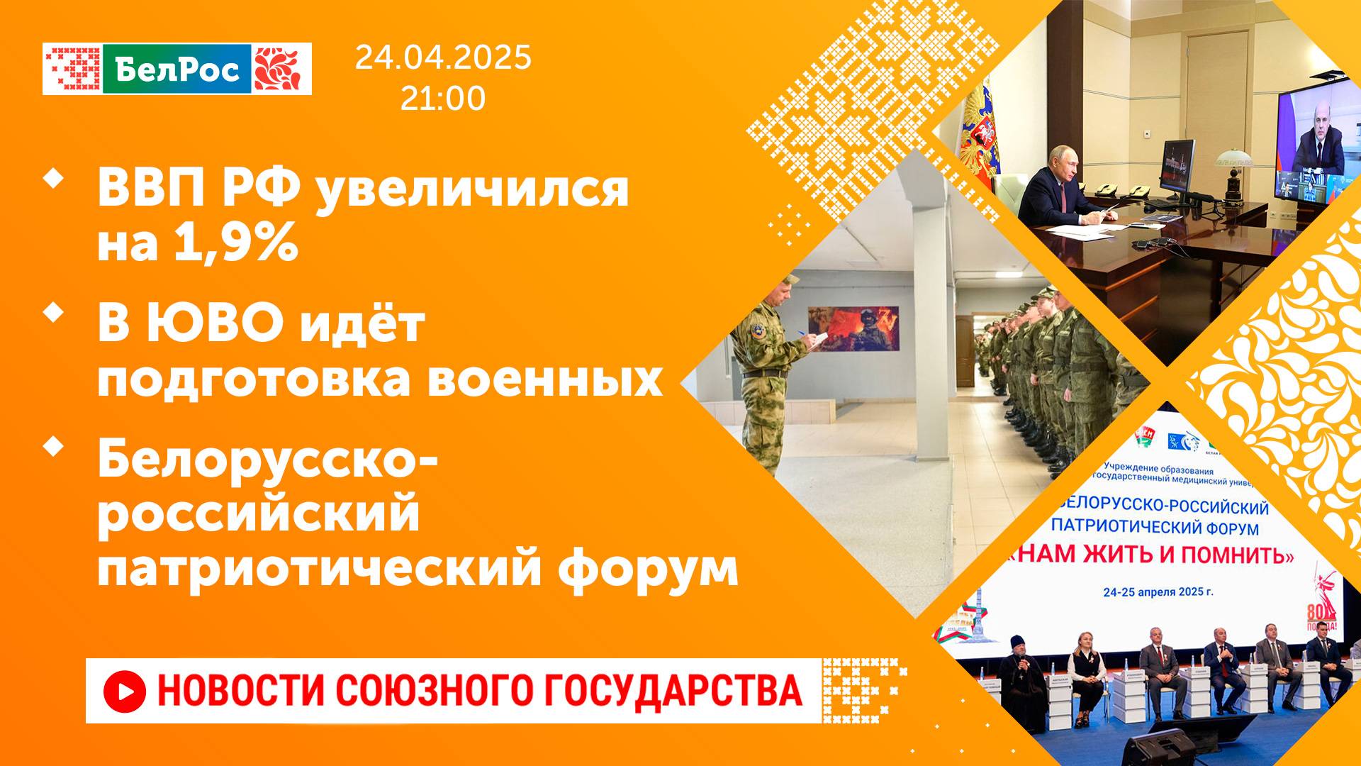 Закадровый текст озвучивает *ИИ Антон* Новости 24.04.2025 на 21:00 - Владимир Путин: с начала 2025 года рост ВВП составил 1,9%. - Операторы дронов помогают артиллерии в Запорожской области. - Истребитель-бомбардировщик Су-34 уничтожил пункт управления беспилотниками ВСУ. - В учебном центре Южного военного округа продолжается подготовка контрактников. - Жителям Курской области выделят больше миллиарда рублей на компенсацию аренды жилья. - Сергей Лебедев передал монеты для проекта "Живая память благодарных поколений". - В Минске проходит белорусско-российский патриотический форум. Смотрите главные новости Союзного государства на телеканале БелРос. Ссылки на наши соц. сети Сайт: http://belros.tv/ Telegram: https://t.me/belrostv Одноклассники: https://ok.ru/group/55657426976918 ВКонтакте: https://vk.com/belrostv TikTok: https://www.tiktok.com/@belros_tv?_t=... RuTube: https://rutube.ru/channel/23501830/ Яндекс. Дзен: https://zen.yandex.ru/belrostvv Наши подкасты на Яндекс. Музыке: https://music.yandex.ru/album/25615251 #главныеновости #новостисегодня #СоюзноеГосударство