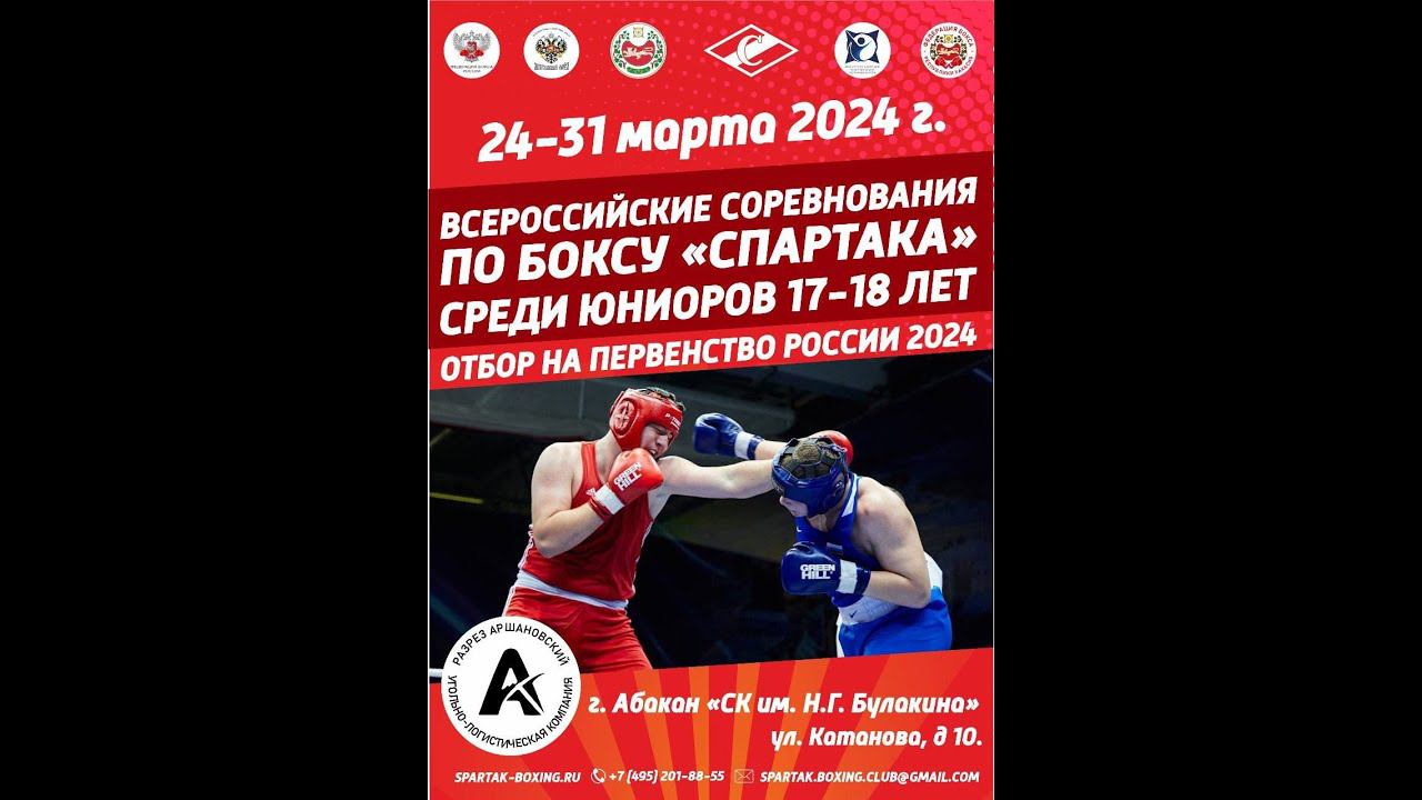 Всероссийские соревнования по боксу на призы «Спартака» среди юниоров (17-18 лет), 24-31 марта 2024 год г. Абакан Подписаться на канал: https://www.youtube.com/c/RussianBoxingFederation/?sub_confirmation=1 Федерация бокса России: http://rusboxing.ru/ ВКонтакте: http://vk.com/rusboxing Телеграм: http://t.me/RussianBoxers Одноклассники: http://ok.ru/group/64339915505917/ Дзен: https://zen.yandex.ru/rusboxing Состав пар #бокс #boxing