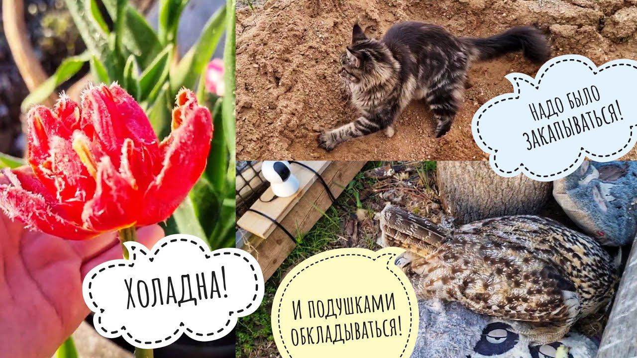 После жаркого апреля без заморозков 1 мая утром было -5°C. Очень красиво, но и очень досадно. Большинство растений разморозилось нормально, но у дорогих саженцев орехов помёрзли почки, у актинидий тоже, листья хосты, некоторые примулы пострадали, хотя я их укрывала. Но это ещё не всё. В ближайшие четыре ночи обещают -2° каждое утро, а это значит, что будет опускаться ниже 5°. Но сове Ёлке всё нравится, погода хорошая, кошка Морошка деловая и довольная, главное, чтобы песочек копался и травка жевалась. #owlhouse #cat #viral