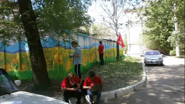 Фото - репортаж. Превращение 400кв. м. серого страшного забора в яркий арт-объект "Поле подсолнухов" АРТ-акция посвящается Дню защиты детей.