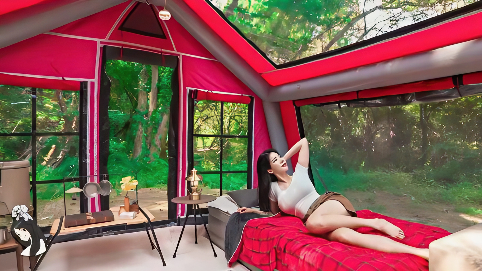 Роскошный кемпинг девушки с собачкой в надувной палатке.