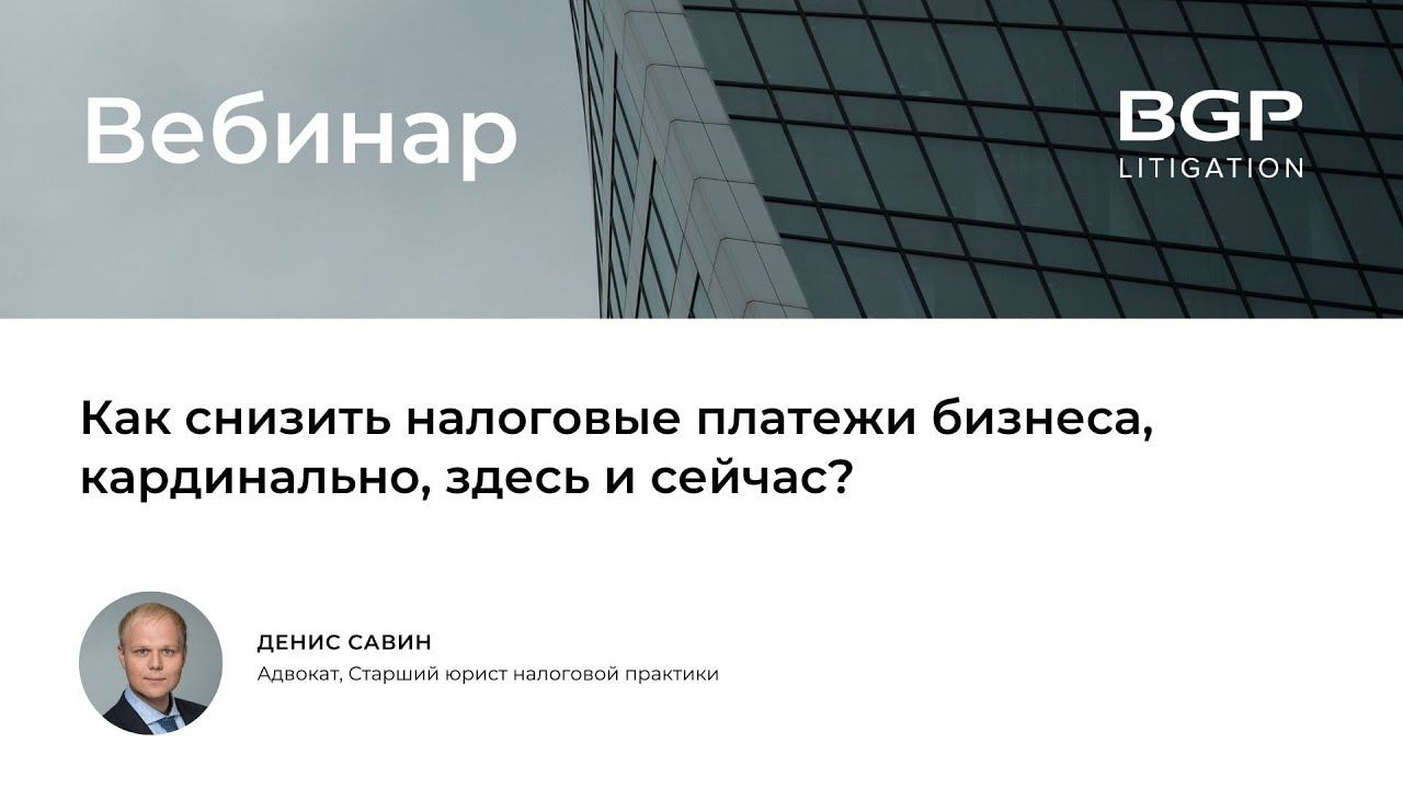 1. Налоговое планирование: какие методы помогут сократить налоговые платежи в ближайшей перспективе? - Продление срока уплаты налоговых платежей. - Отсрочки и рассрочки налоговых платежей – как получить, с какими сложностями можно столкнуться? - Льготные ставки, как мера поддержки бизнеса. Метод получения. - Изменение метода исчисления авансовых платежей, как способ уменьшения налога к уплате. - Как не платить за контрагента, в случае требования налогового органа? 2. Выявление налоговых резервов и их реализация, в целях экстренного снижения сумм текущих налоговых платежей. 3. Нюансы налогообложения актуальных сделок по продаже бизнеса/активов, предоставлению внутригрупповых займов, выводу прибыли, а также передаче активов внутри группы компаний. 4. Прекращение предпринимательской деятельности, в случае отсутствия иных вариантов. Спикер - Денис Савин, адвокат, старший юрист налоговой практики BGP Litigation Присоединяйтесь к BGP Litigation в социальных сетях: ▪️Facebook https://www.facebook.com/bgplitigation ▪️Telegram https://msto.me/card1620203889/ Связаться с нами: ▪️https://bgplaw.com ▪️office@bgplaw.com ▪️+7 (495) 777 28 20