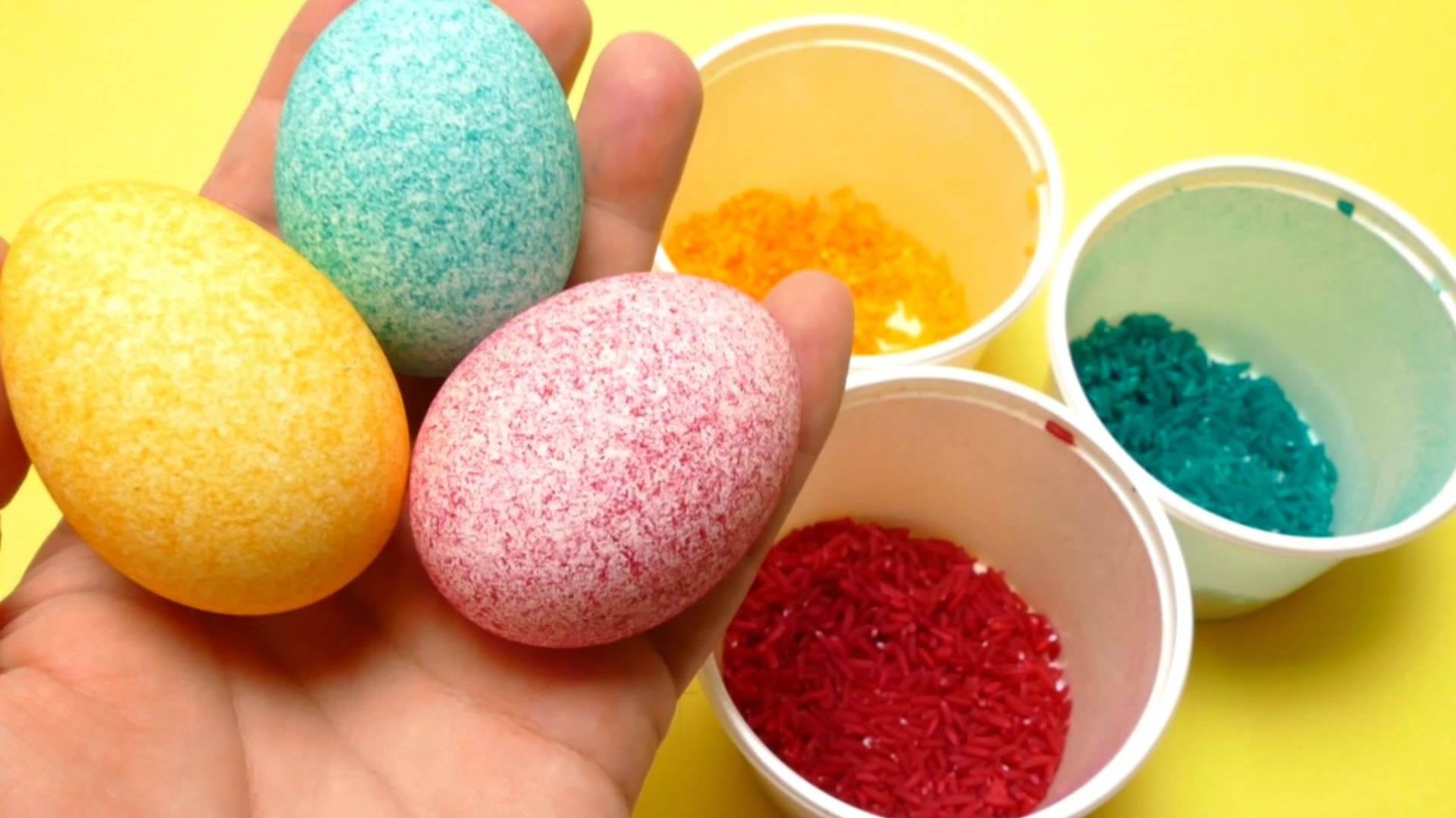 Как покрасить яйца на Пасху в рисе жидкими красителями.