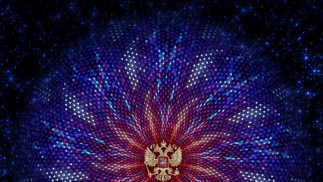 Калейдоскоп мерцающих узоров. Круговая сияющая абстрактная анимация вокруг герба РФ. Фон в 4K.