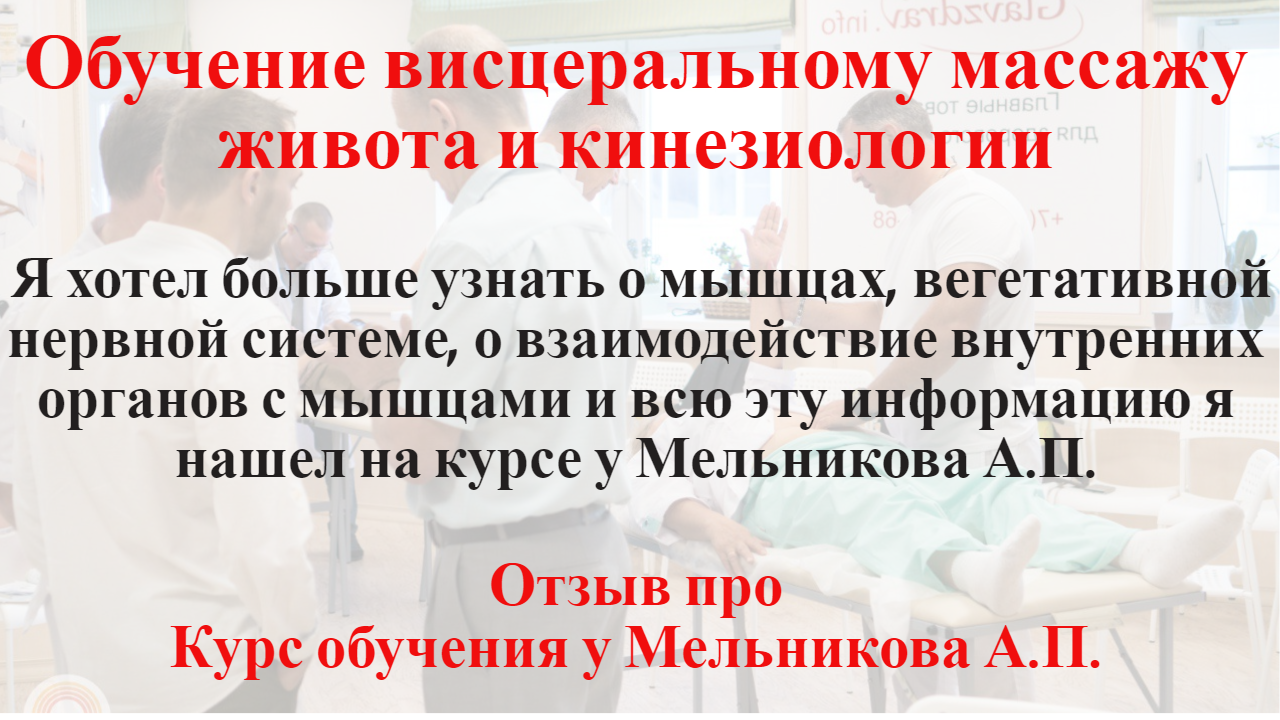 « Я хотел больше узнать о мышцах, вегетативной нервной системе, про взаимодействие внутренних органов с мышцами и всю эту информацию я нашел на курсе у Мельникова А.П. по висцеральному массажу живота и кинезиологии. Я очень благодарен Мельникову А.П. за предоставленную информацию, за уделенное для нас время и возможность поработать с ним. Мне очень понравился курс по висцеральному массажу и кинезиологии, я уже в предвкушение того, как начну применять полученные знания на своих пациентах. Я считаю, что очень большой круг людей нуждается в данной методике. Я рекомендую пройти обучение у Мельникова А.П. каждому человеку, особенно, массажистам, костоправам, врачам и всем тем, кто хочет понять традиционную медицину, как работают мышцы, рефлексы ✅ Подробнее про обучение кинезиологии и висцеральному массажу живота и бронь места на курсе https://ruszdrava.ru ✅ Связаться с менеджером и задать вопросы про обучение на курсах: +79222160707