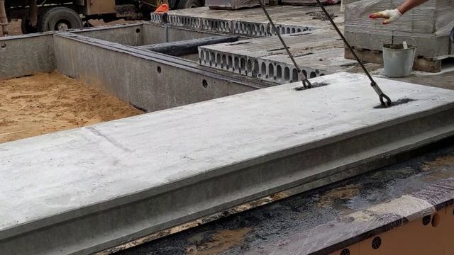 Небольшое видео с процессом перекрытия фундамента плитами.
