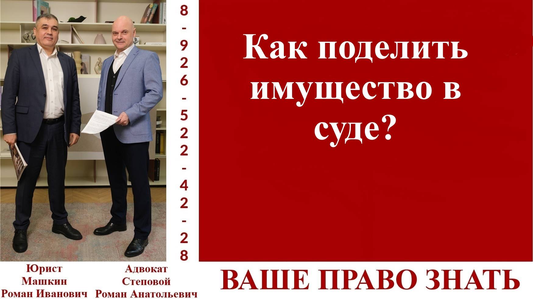 Телефон для консультаций +7-926-522-42-28 https://t.me/vashepravo_znat группа в Телеграмм для общения. Канал «Ваше право знать» создан для помощи гражданам в решении их юридических и не только вопросов. В форме кратких консультаций эксперты канала доступно рассказывают о возможных путях выхода из сложных правовых ситуаций. Основной целью канала является оказание аудитории юридических услуг и повышение правовой грамотности населения. Эксперты канала простым и понятным языком рассказывают о практической юриспруденции на конкретных примерах. Подписывайтесь на наш канал, обращайтесь с вопросами и за помощью. Мы найдем время для каждого. ЭКСПЕРТЫ: Машкин Роман Иванович, практикующий юрист со стажем 23 года, 2 Высших образования: Ставропольское ВАИУ (первые два года СВАУЛШ): штурманский факультет, Инженер по управлению воздушным движением. В 2000 году Военный Университет МО РФ, юрисконсультский факультет, юрист. Начальник юридической группы в МО РФ, Помощник начальника Управления по правовой работе-начальник правового управления в Управлении по использованию воздушного пространства РФ, генеральный директор и учредитель Юридической компании и Агентства Недвижимости «МД-Недвижимость», член совета директоров Холдинга «Моя Семья». Правовое сопровождение телевизионных проектов Дом-2, Суд Идет, Машина, Мама в Законе, международных телевизионных проектов. Являлся экспертом в телевизионных программах на телеканалах ТНТ, МИР, ТВЦ, участник круглых столов ТПП, Госдуме РФ, участник конференций, проводимых Минстроем России, член школы переговоров Игоря Рызова, состоит в деловом клубе Екатерины Уколовой. Правовое сопровождение компаний и ИП, представительство в Арбитражных судах и судах общей юрисдикции по вопросам налогового права, гражданского права, международного права. Банкротство юридических лиц. Семейное право. Сопровождение сделок с недвижимостью в РФ и за рубежом. Степовой Роман Анатольевич, адвокат, руководитель адвокатского кабинета. С 2002 года успешно осуществляет адвокатскую деятельность по представлению интересов и защите прав граждан и юридических лиц. С 2000 по 2019 года преподавал на юридическом факультете Московского государственного областного университета, (ныне Государственный университет просвещения), дисциплины гражданско-правового и государственно-правового профиля. Автор многочисленных публикаций по вопросам прикладной юриспруденции. В работе с клиентами придерживается принципов порядочности и профессионализма. В любой ситуации ищет оптимальную модель правового поведения и минимизирует потери клиента. Основную задачу видит в осуществлении реальной помощи доверителям и подзащитным. В общении с клиентами максимально честен. Майор юстиции запаса. Телефон для консультаций +7-926-522-42-28 Смотрите нас где удобно https://t.me/vashe_pravo_znat Телеграмм канал проекта "Ваше право знать." https://t.me/vashepravo_znat группа в Телеграмм для общения. https://www.youtube.com/@user-ki6nr6zh3p канал Ваше право знать на Ютюб https://rutube.ru/channel/30527736/ канал Ваше право знать на Рутюб https://vk.com/public219361576 сообщество во Вконтакте https://www.youtube.com/@user-zt2rt7vh1m канал Ютюб адвоката Романа Степового https://md-rielt.ru/ сайт МД-Недвижимость https://степовой.рф сайт адвоката Степового Романа Анатольевича #ВашеПравоЗнать #ЮристМашкинРоман #ЮристРоманМашкин #ЮристМашкинРоманИванович #АдвокатСтеповойРоман #АдвокатР