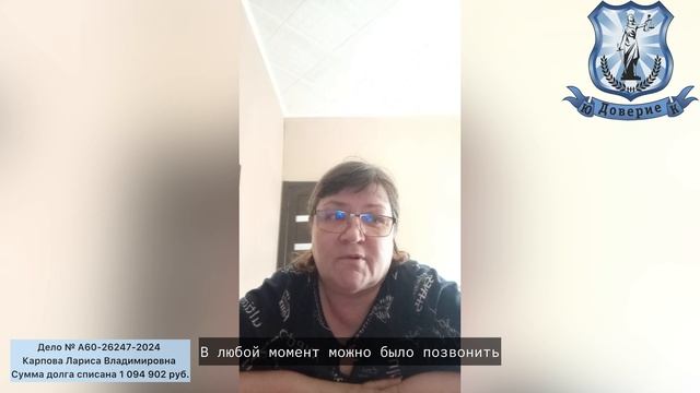 Дело № А60-26247-2024 Карпова Лариса Владимировна Сумма долга списана 1 094 902 руб. Списание кредитов и долгов! Банкротство физических лиц! 🤝 Давайте знакомиться❗ ⚡Мы - Юридическая Компания "Доверие"! ✅ Списали более 100 000 000 рублей задолженностей ✅ 30 000 выигранных судебных дел; ✅ 18 филиалов на территории РФ и отдел дистанционной юридической помощи; ✅ 9 лет мы законно освобождаем от долгов и кредитов ✅ 5000 счастливых клиентов. ✅ 💯% гарантия списания долга, прописанная в договоре 💼 Оказываем процедуру полностью под ключ, с гарантией прописанной в договоре❗ ⚡Бесплатная консультация: ☎ 8(800)775-24-43; 🌐 https://doverie2007.ru/ и 🟦 https://vk.com/doverie_ekb_07 💯% поможем и Вам!