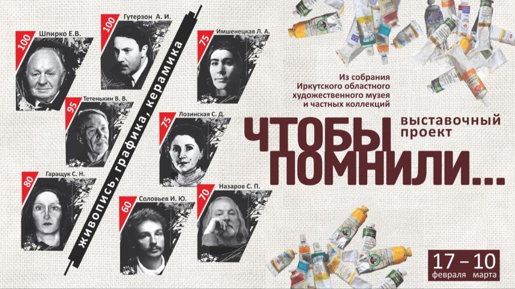 С 22 февраля 2022 года в Иркутске в Галерее сибирского искусства (ул. Карла Маркса, 23) начала работу новая выставка долгосрочного проекта «Чтобы помнили…» памяти иркутских художников разных поколений, оставивших яркий и значительный след в изобразительном искусстве Приангарья. В этом году музей представит творчество восьми художников, со дня рождения которых прошло от 60 до 100 лет. Экспозиция посвящена 90-летию Иркутского отделения Союза художников России и является первым событием в череде мероприятий к юбилейной дате. Кураторский выставочный проект искусствоведа Тамары Драницы «Чтобы помнили…» существует уже более десяти лет и ставит своей задачей показать через творчество ушедших художников общую историю развития изобразительного искусства Иркутской области. Авторы-юбиляры этого года — Евгений Шпирко (100 лет со дня рождения), Аркадий Гутерзон (100 лет), Владимир Тетенькин (95 лет), Светлана Гаращук (80 лет), Любовь Имшенецкая (75 лет), Станислава Лозинская (75 лет), Сергей Назаров (70 лет), Игорь Соловьев (60 лет). В экспозиции представлено около 50 работ живописи, графики и декоративно-прикладного искусства. Среди них — психологически достоверные портреты, лирические и символические образы природы, насыщенная ассоциациями керамика, которая покоряет высоким мастерством исполнения. Представленные на выставке произведения иркутских художников из собрания музея отмечены высокими художественными достоинствами, глубиной идейно-образного содержания и высоким гуманистическим пафосом.