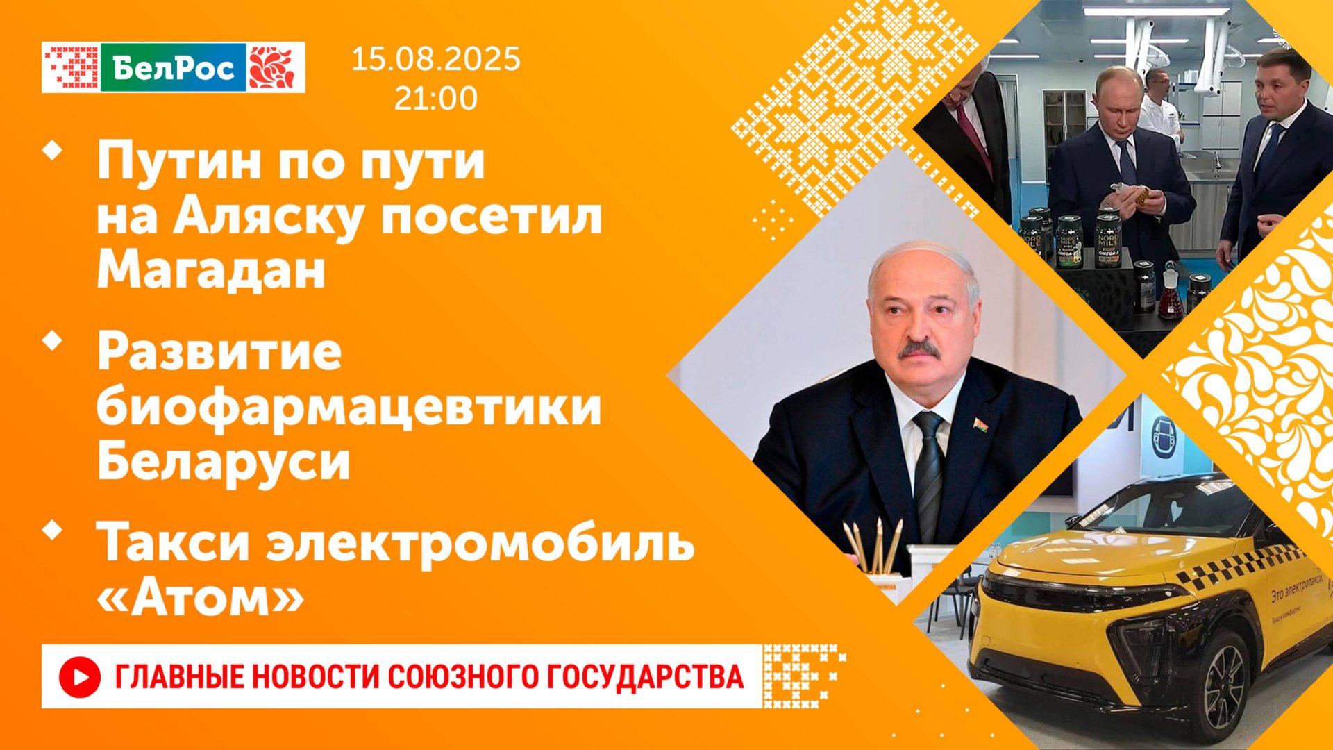 Закадровый текст озвучивает *ИИ Антон* Новости 15.08.2025 на 21:00 - Перед саммитом Россия-США на Аляске Владимир Путин посетил Магаданскую область. - Александр Лукашенко и Дональд Трамп поговорили по телефону. - Президент Беларуси собрал совещание по развитию биофармацевтики. - На Евразийском форуме такси представили передовые разработки в сфере перевозок. - Славянский форум искусств проходит с 15 по 19 августа в 6 городах Ярославской области. Смотрите главные новости Союзного государства на телеканале БелРос. Ссылки на наши соц. сети Сайт: http://belros.tv/ Telegram: https://t.me/belrostv Одноклассники: https://ok.ru/group/55657426976918 ВКонтакте: https://vk.com/belrostv TikTok: https://www.tiktok.com/@belros_tv?_t=... RuTube: https://rutube.ru/channel/23501830/ Яндекс. Дзен: https://zen.yandex.ru/belrostvv Наши подкасты на Яндекс. Музыке: https://music.yandex.ru/album/25615251 #главныеновости #новостисегодня #СоюзноеГосударство