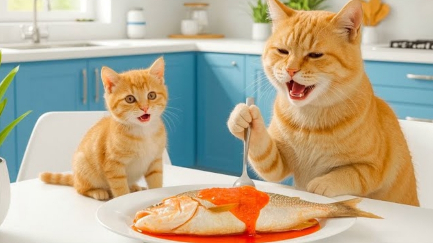 Котенок едет с мамой на рыбалку , а потом готовят свежую рыбу.