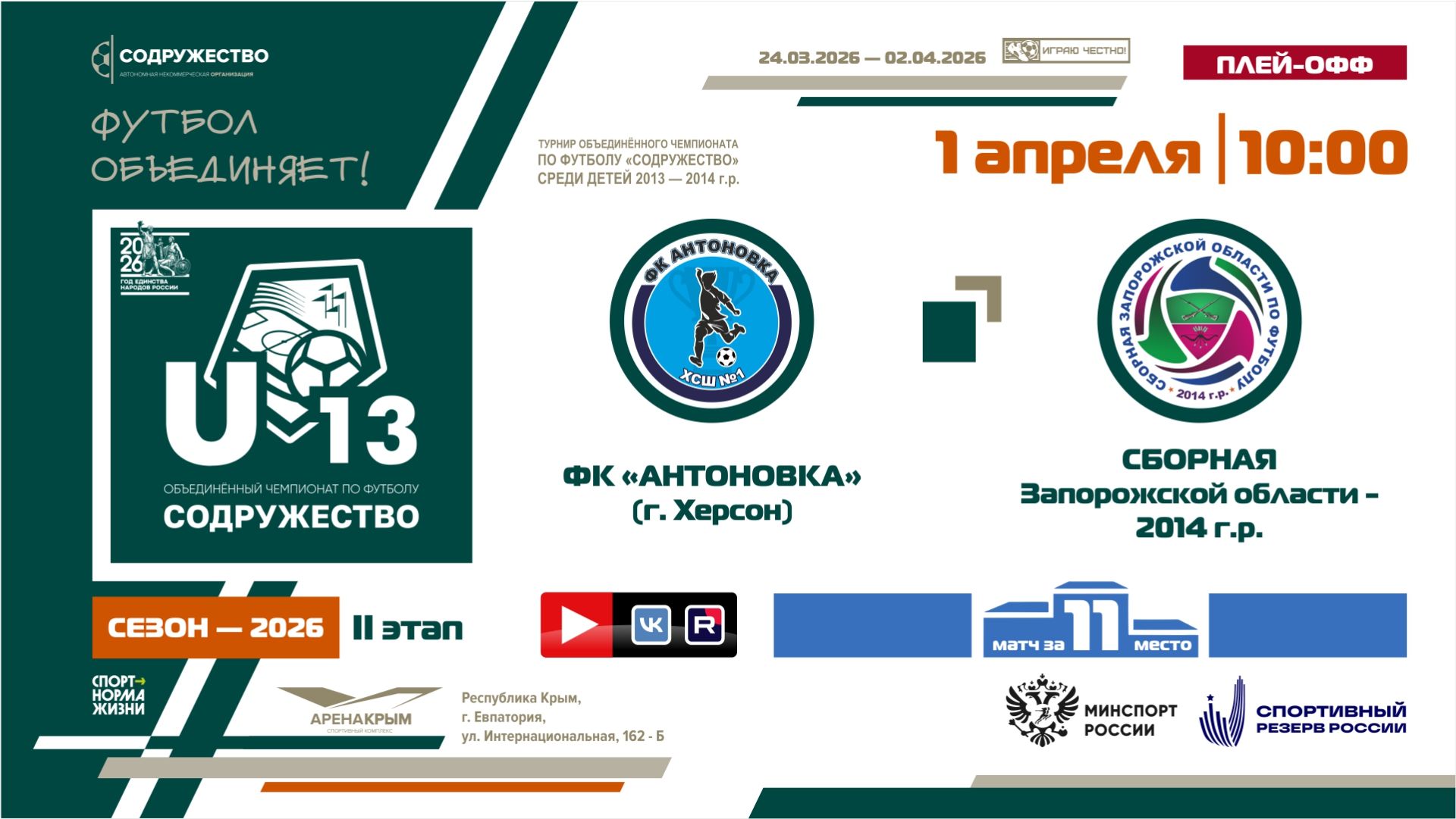 Игра за 11-ое место | ФК «Антоновка» (г. Херсон) - Сборная Запорожской области 2014 г.р. | 1.04.2026