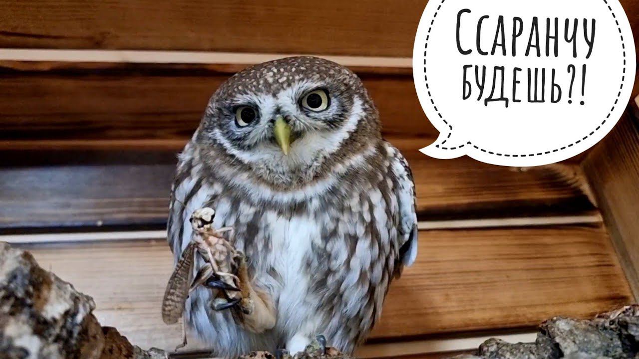 Домовые сычи хрустят саранчой. Кто вкуснее ест: Лучик, Кутуша или ХЗ? Чем кормить сову?