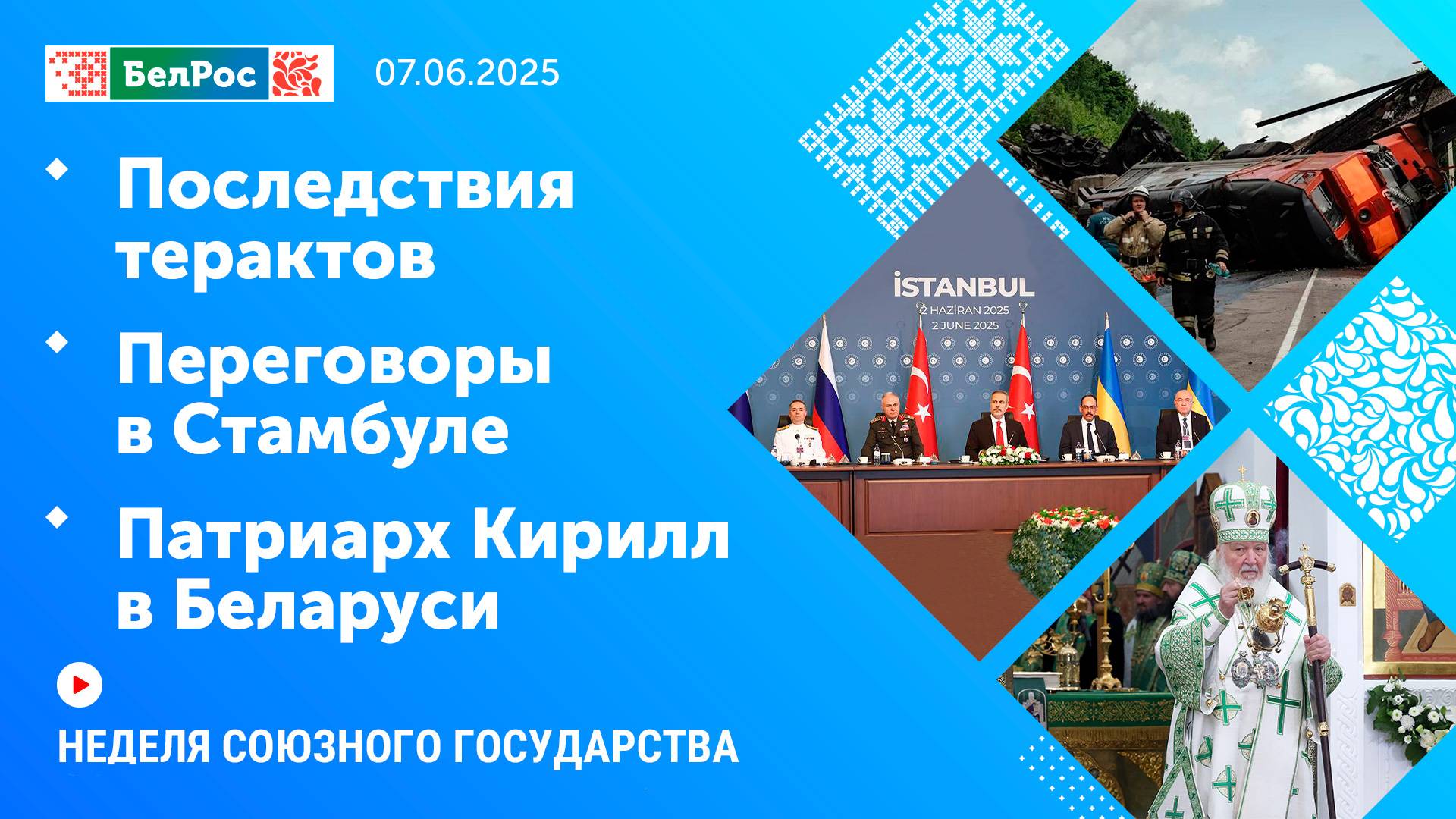 ▶️ Владимир Путин поручил оказать людям всю необходимую помощь и подчеркнул: нет сомнений, что удар по гражданским лицам наносился намеренно. ▶️ О чём говорят российские и украинские варианты меморандума? И почему, несмотря ни на что, Москва идёт на очередной гуманитарный шаг и передаёт Киеву 6 тысяч тел погибших солдат? ▶️ Патриарх вручил Александру Лукашенко высшую награду РПЦ и посетил Спасо-Евфросиниевский женский монастырь, который отметил 900-летие с момента основания. Эксклюзивный репортаж из Полоцка. ▶️ Товарооборот больше ста миллионов долларов и десятки совместных проектов в самых разных сферах. Почему именно Великий Новгород стал площадкой для очередной встречи союзных парламентариев и о каких будущих совместных проектах удалось договориться? 👉Подробности - в нашей программы «Неделя Союзного государства» Не пропустите! ✨ Эфир: 07.06.2025 Ссылки на наши соц. сети Сайт: http://belros.tv/ Telegram: https://t.me/belrostv Одноклассники: https://ok.ru/group/55657426976918 ВКонтакте: https://vk.com/belrostv TikTok: https://www.tiktok.com/@belros_tv?_t=... RuTube: https://rutube.ru/channel/23501830/ Яндекс. Дзен: https://zen.yandex.ru/belrostvv Наши подкасты на Яндекс. Музыке: https://music.yandex.ru/album/25615251 #подрывмостов #переговорывСтамбуле #ПатриархКириллвБеларуси
