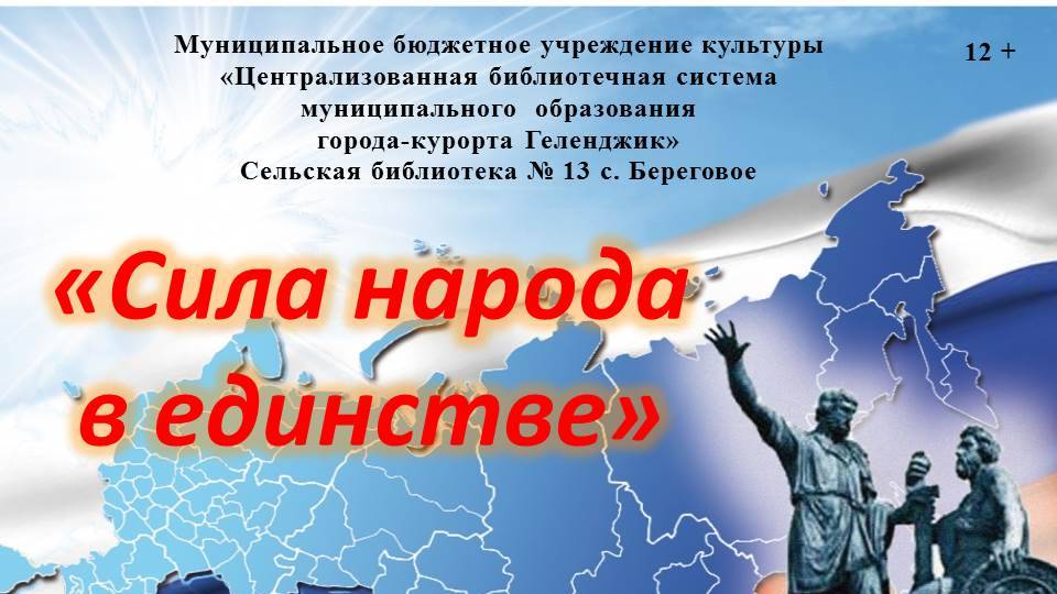 Сельская библиотека № 13 села Береговое подготовила видео – обзор «Сила народа в единстве», посвящённая Дню народного единства. Цель учреждения Дня народного единства – сплотить жителей России независимо от социального положения, национальности или вероисповедания. В этот день граждане страны вспоминают исторические события, к которым приурочено это торжество, и устраивают массовые мероприятия. День народного единства – российский государственный праздник. Отмечается 4 ноября, начиная с 2005 года. Это праздник – патриотизма, взаимопомощи, единения всех российских народов. Праздник учрежден в память о событиях 1612 года, когда народное ополчение под предводительством Козьмы Минина и Дмитрия Пожарского освободило Москву от польских интервентов, продемонстрировав образец героизма и сплоченности всего народа вне зависимости от происхождения, вероисповедания и положения в обществе. Это день соединения прошлого, настоящего и будущего, объединения всех людей нашей огромной страны в любви друг к другу, к своему краю, к России. В единстве наша сила! #ЧитающийГеленджик, #БиблиотекиГеленджика, #Народов много- родина одна, #КубаньВсенародная