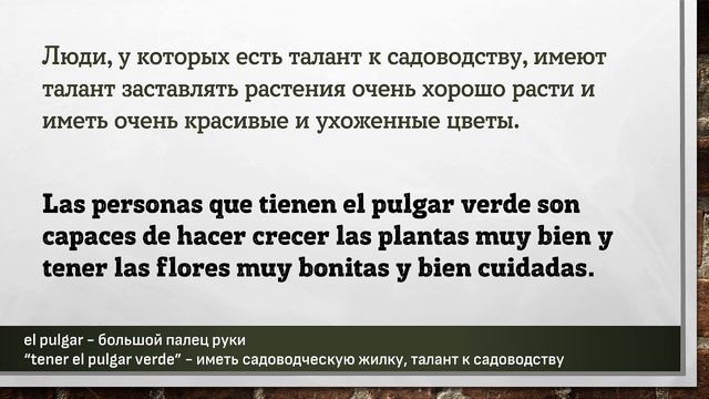 Урок основан на эпизоде подкаста взятом на сайте https://www.spanishpodcast.net Полная ссылка на эпизод подкаста с транскрипцией: https://www.spanishpodcast.net/spanish-idioms-verde/ Полная ссылка на аудио файл эпизода: https://ia801706.us.archive.org/29/items/gggjsioeiuruxoivnsnsns446espsplean_202010/gggjsioeiuruxoivnsnsns446espsplean.mp3?_=1 Данный материал предназначен исключительно в образовательных целях. Цель – заставить мышление учащегося формировать фразы, части фраз, на испанском языке. Каждая фраза повторяется три раза. Повторения происходит не подряд, а с некоторым "смещением", заставляя всё время мысленно переключаться на другую фразу. Пауза между фразами служит для того, чтобы вспомнить хотя бы одно слово, часть фразы или всю фразу на испанском языке. Чем длиннее фраза на русском языке – тем длиннее пауза до фразы на испанском языке. Достаточно, если человек самостоятельно начинает формировать хотя бы кусочки фразы, некоторые слова. Данный вид упражнений не стоит делать более одного часа за один раз. Достаточно прослушивать такие упражнения в фоновом режиме: замимаясь домашними делами, находясь в дороге или на прогулке, занимаясь спортом. Чтобы выучить любой язык необходимо «провести с ним» 10 000 часов. #испанский #испания #слова #фразы #aprender #español #españa #español #испанскийязык #испанскийбесплатно #испанскийэффективно #учимиспанский #испанскийучить #shadowing #ShadowingTechnique #Lerntechnik #произношение #грамматика #subjuntiv #expresiones #shadowingmethode #эффективно #españolonline #españoloffline #aprenderespanolonline #pimsleur #paulpimsleur Слова и выражения из этой части подкаста: ================================================ "Ser un verde" - быть сексуально озабоченным, пошлить conseguirás que ... (+subj) - ты добъёшься, чтоБЫ случилось БЫ что-то el pecado - грех, порок el pulgar - большой палец руки la avaricia - жадность la envidia - зависть la gula - обжорство la ira - гнев, злоба la lujuria - похоть la pereza - лень la riqueza - богатство la soberbia - гордыня los pecados capitales - смертные грехи poner verde - наорать, оскорбить, отчитать, говорить гадости se le da muy bien - ему очень хорошо удаётся “estar verde” - быть ещё зелёным, неопытным “tener el pulgar verde” - иметь садоводческую жилку, талант к садоводству