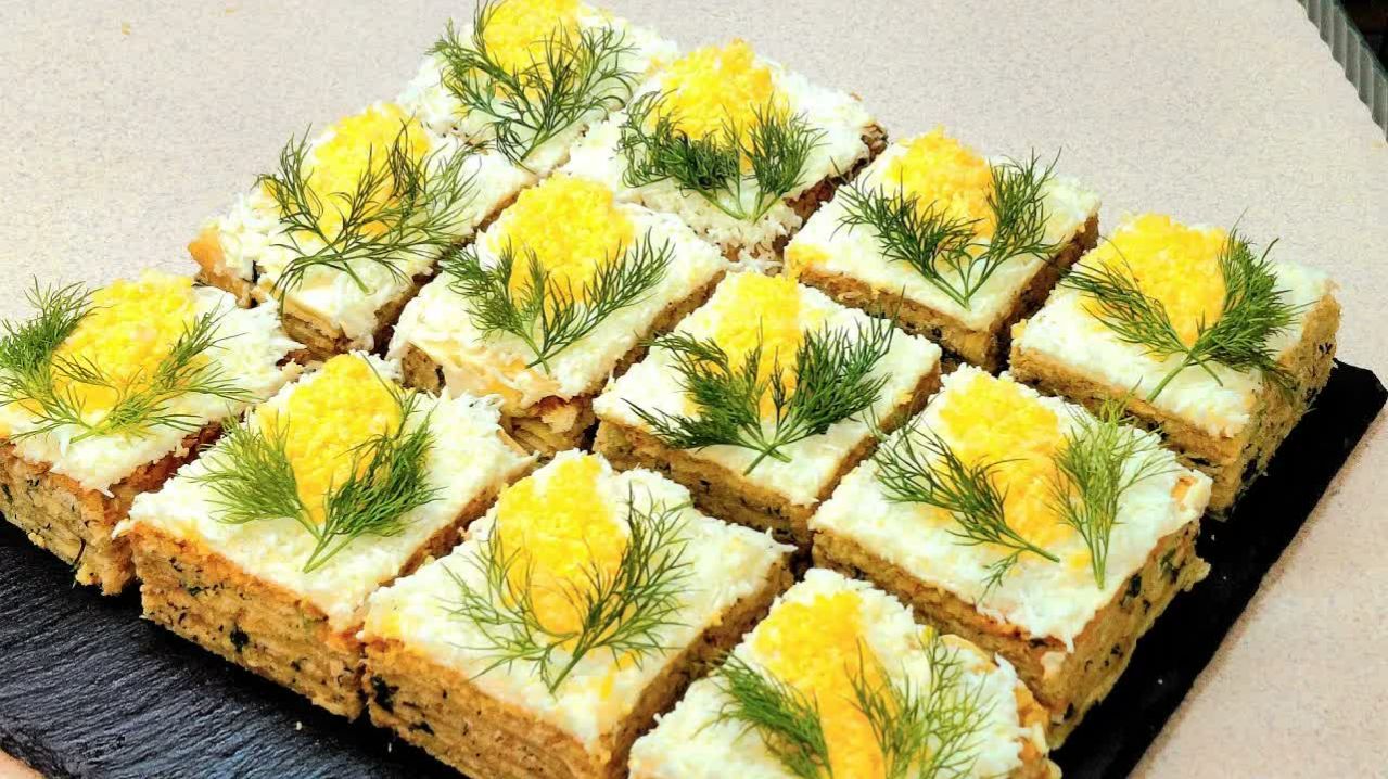 Весеннее настроение. Пирожное ,,Мимоза" к 8 марта ИНГРЕДИЕНТЫ мука -450гр сливочное масло-250гр сметана-200гр можно заменить на кефир,только нужно уменьшить до150 гр яйцо-1шт соль,сахар и сода по 0,5ч.л консерва рыбная 500гр (2банки по250) 2-3яйцавареных сыр -100гр чеснок по желанию майонез для украшения 3-4 яйца майонез всего майонеза ушло 350 гр зелень укропа