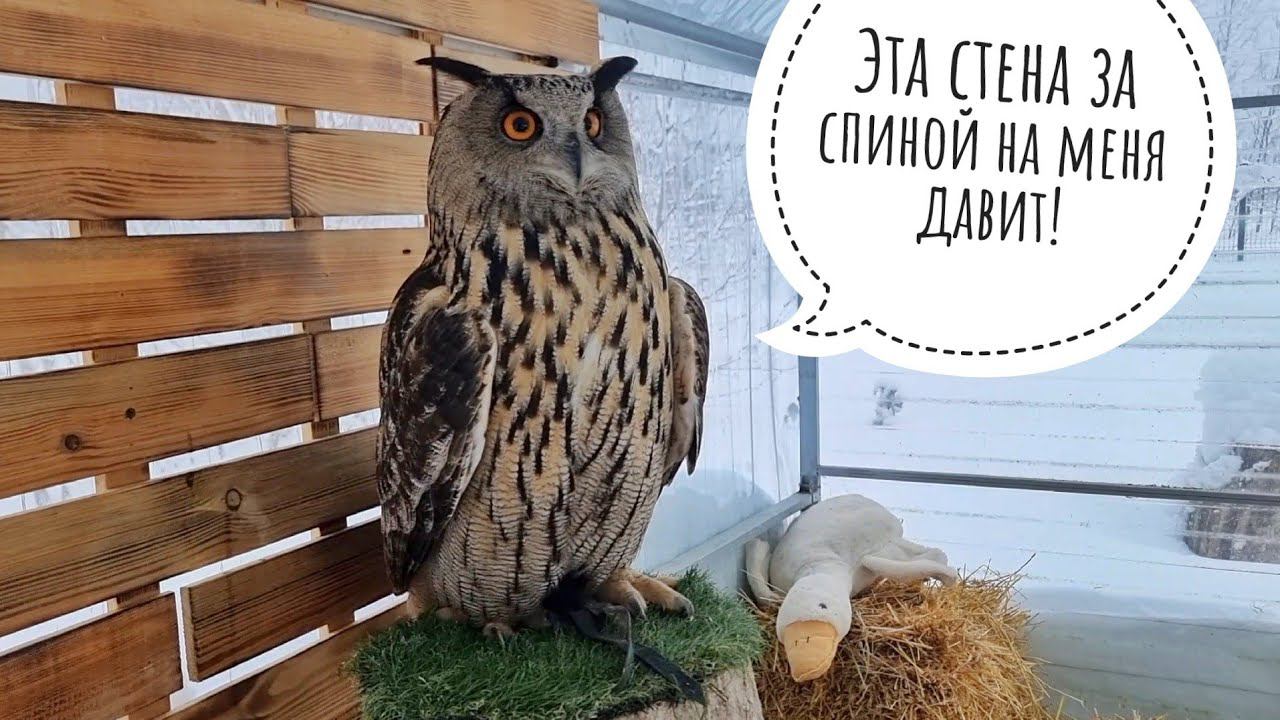 Сова Ёль не довольна новым интерьером вольера: ты зачем это повесила?!