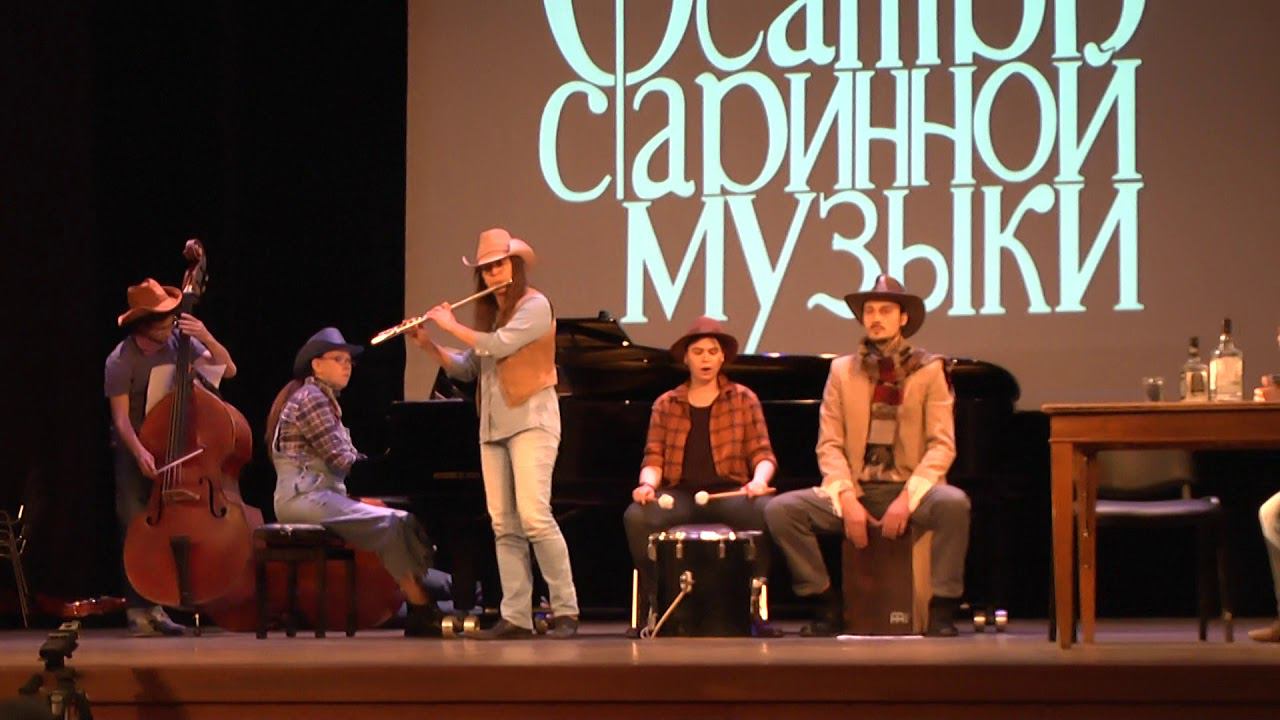 14 E Morricone Theatrical composition Ecstasy of Gold. Э. Морриконе. Театрализованная композиция «Ecstasy of Gold», аранжировка Д. Резанова. Исполняют С. Дорофеева (сопрано), Е. Быркина (сопрано), Е. Фирсова (сопрано), В. Немошкалова (меццо-сопрано), С. Косачева (меццо-сопрано), А. Качалов (бас), И. Балашов (бас), Е. Смирнова (флейта), В. Валиев (контрабас), Д. Резанов (контрабас). Партия фортепиано – М. Стародубова